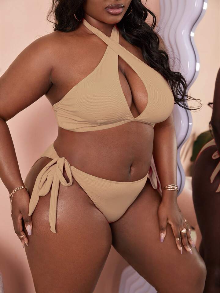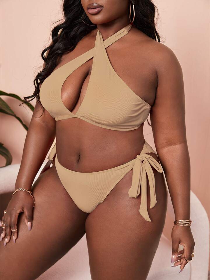 Conjunto de bikini en tallas grandes con ribete cruzado y lazo en el lateral para playa de verano