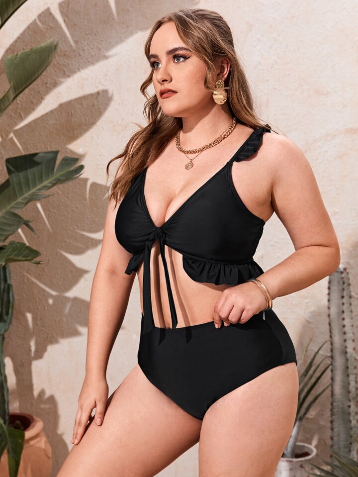 Conjunto de bikini de talla grande con cintura alta y ribete de volantes para playa de verano