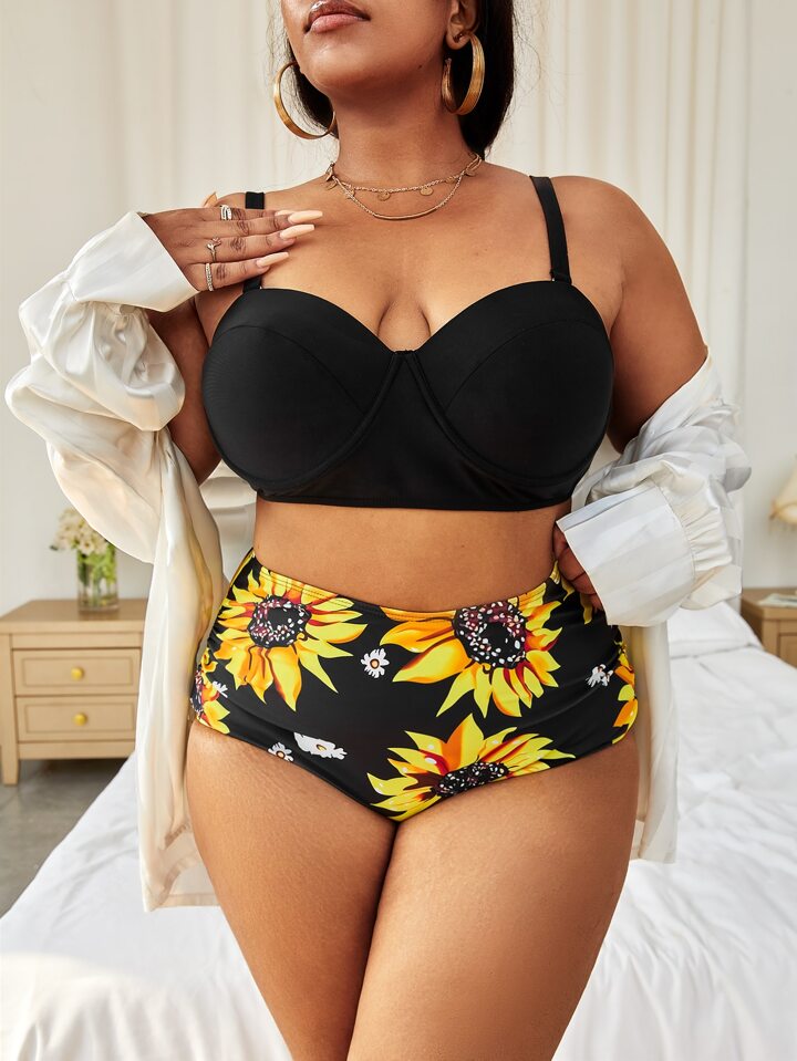 Conjunto de bikini estampado de girasol con soporte para aumento de tallas grandes para verano en la playa