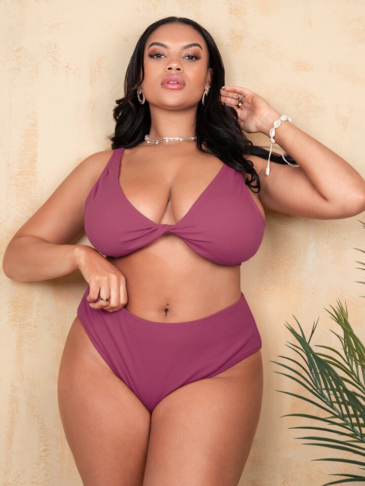 Conjunto de bikini de talle alto con nudo delantero talla grande para playa de verano