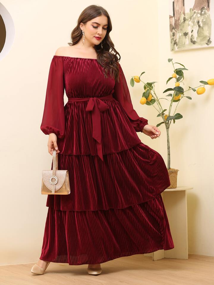 Vestido de terciopelo con escote Bardot, con cinturón y con capas, talla grande