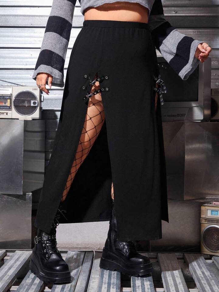 Falda Con Dobladillo Dividido De Color Liso Para Mujer De Talla Grande Con Hebilla Metálica Con Ojales