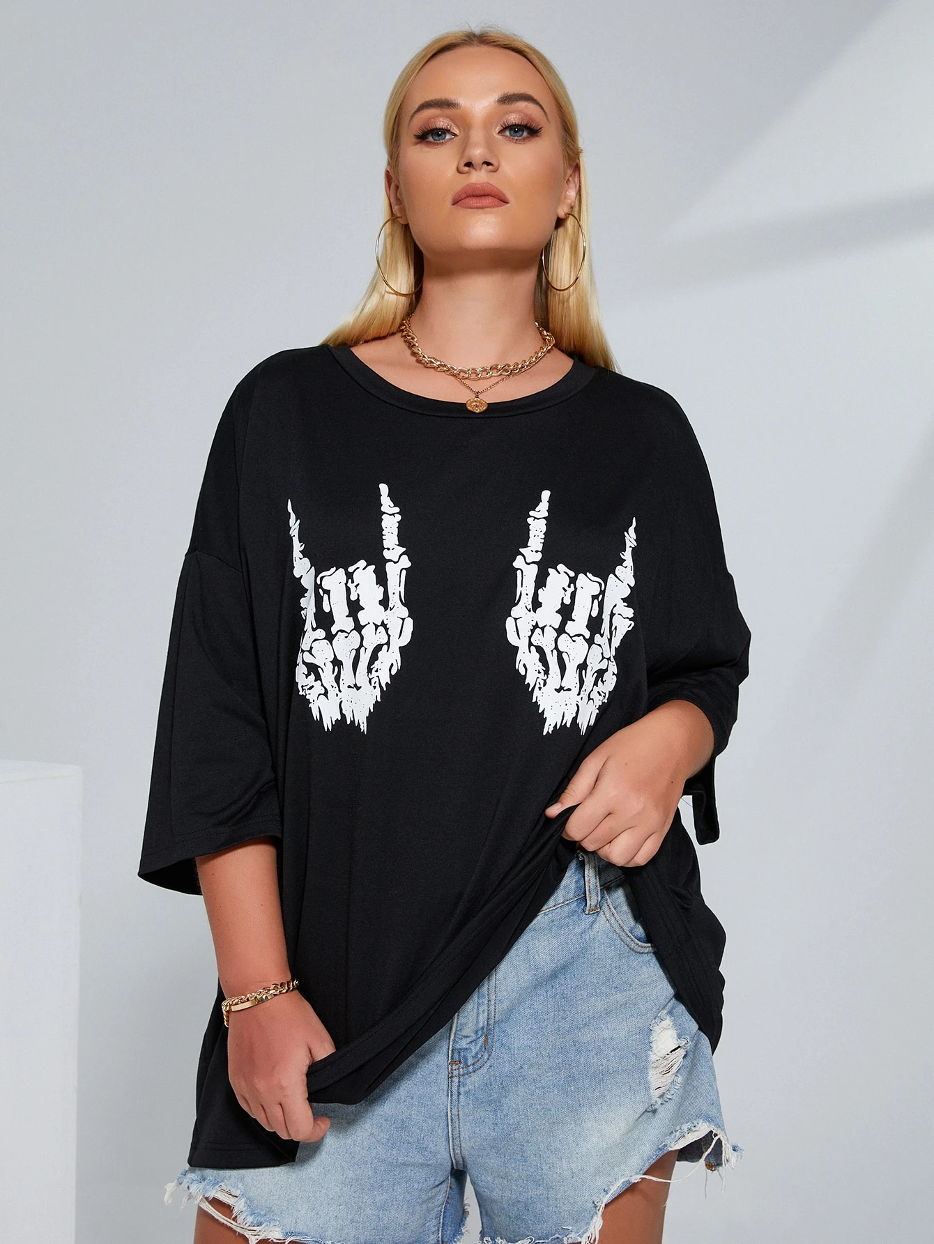Camiseta de hombros caídos con estampado de mano de esqueleto