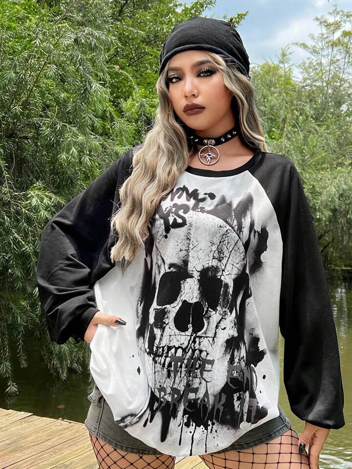 Talla grande Sudadera estampado de cráneo de manga raglán