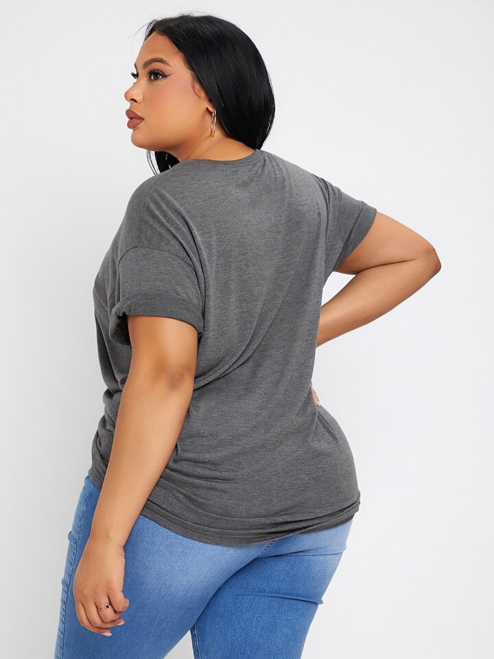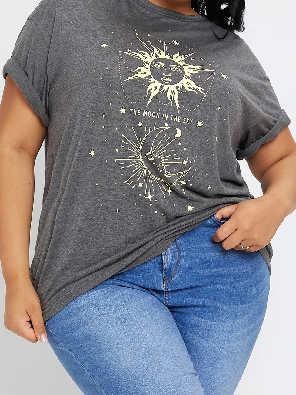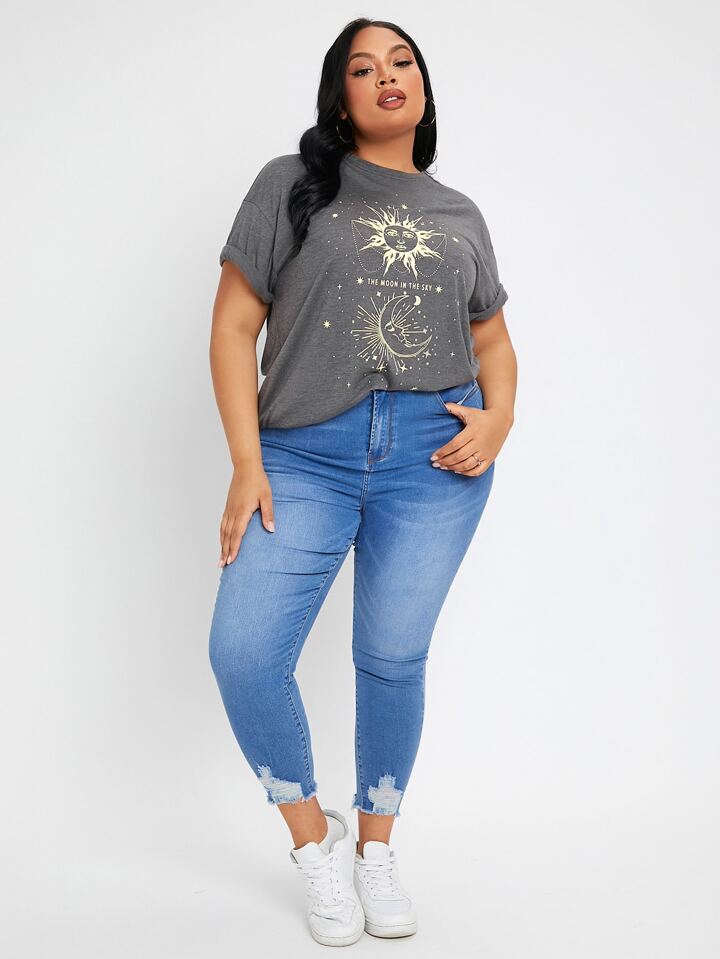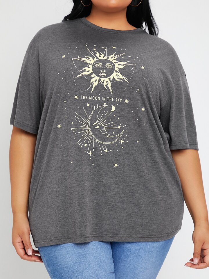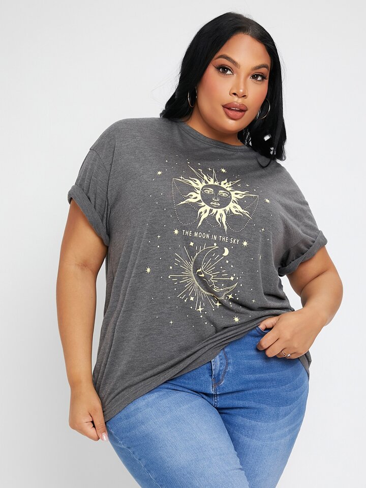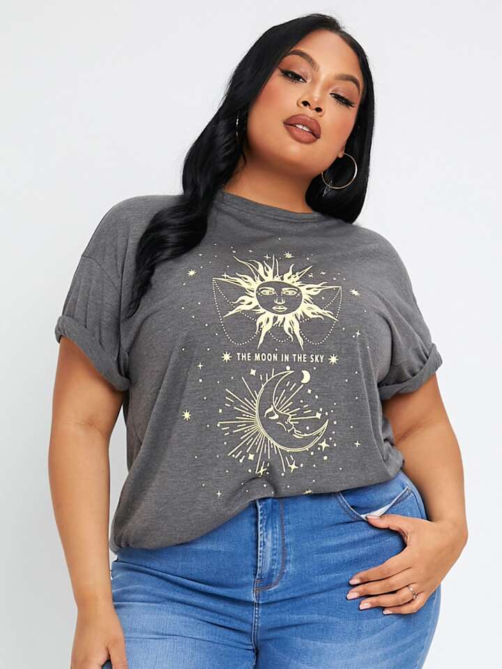 Camiseta con estampado de sol y luna de manga enrollada