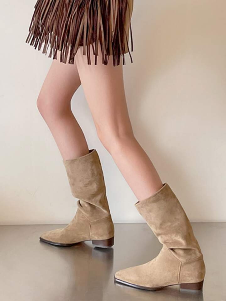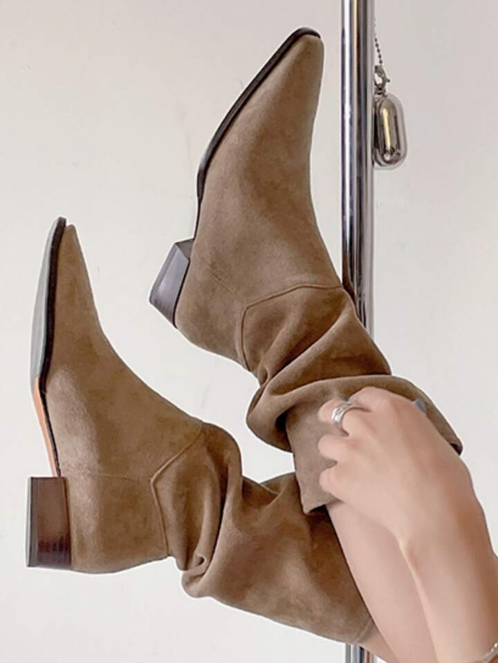 Botas arrugadas de punta con tacón grueso de serraje falso