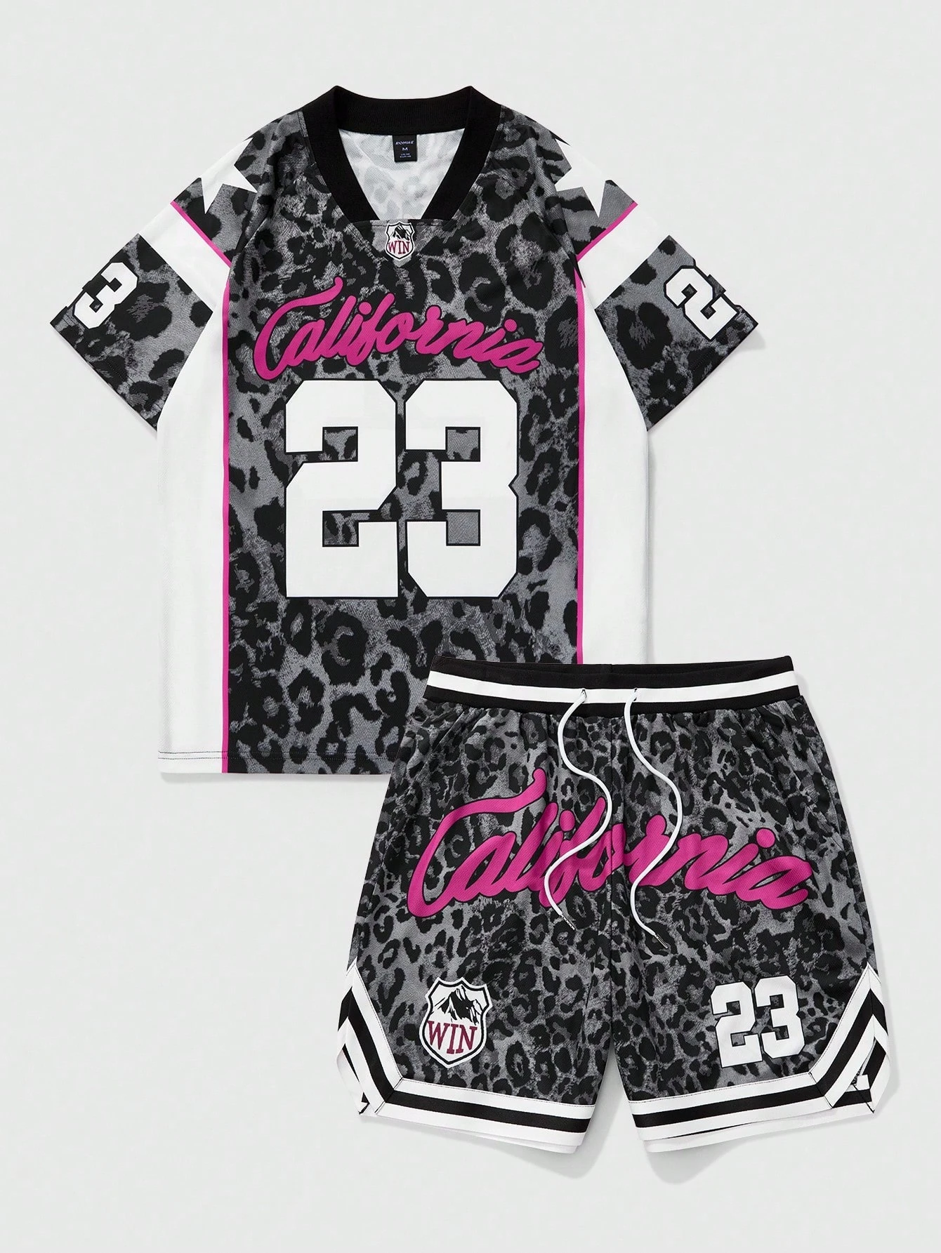 Prep Set de 2 piezas compuesto por camiseta y shorts de baloncesto con estampado de leopardo para hombre