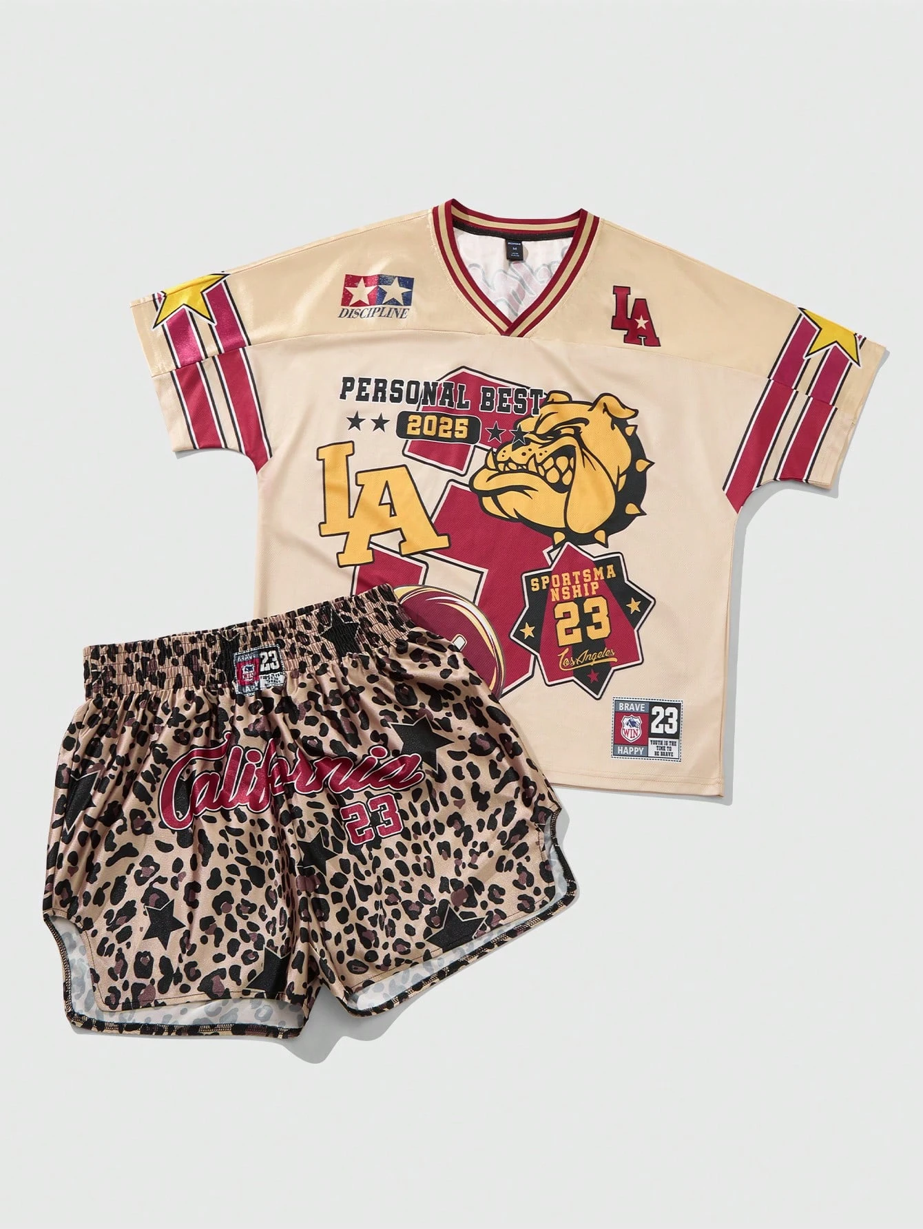 Prep Set de 2 piezas Camiseta de manga corta de punto y pantalón corto de estilo callejero Y2K para hombre, adecuado para primavera/verano