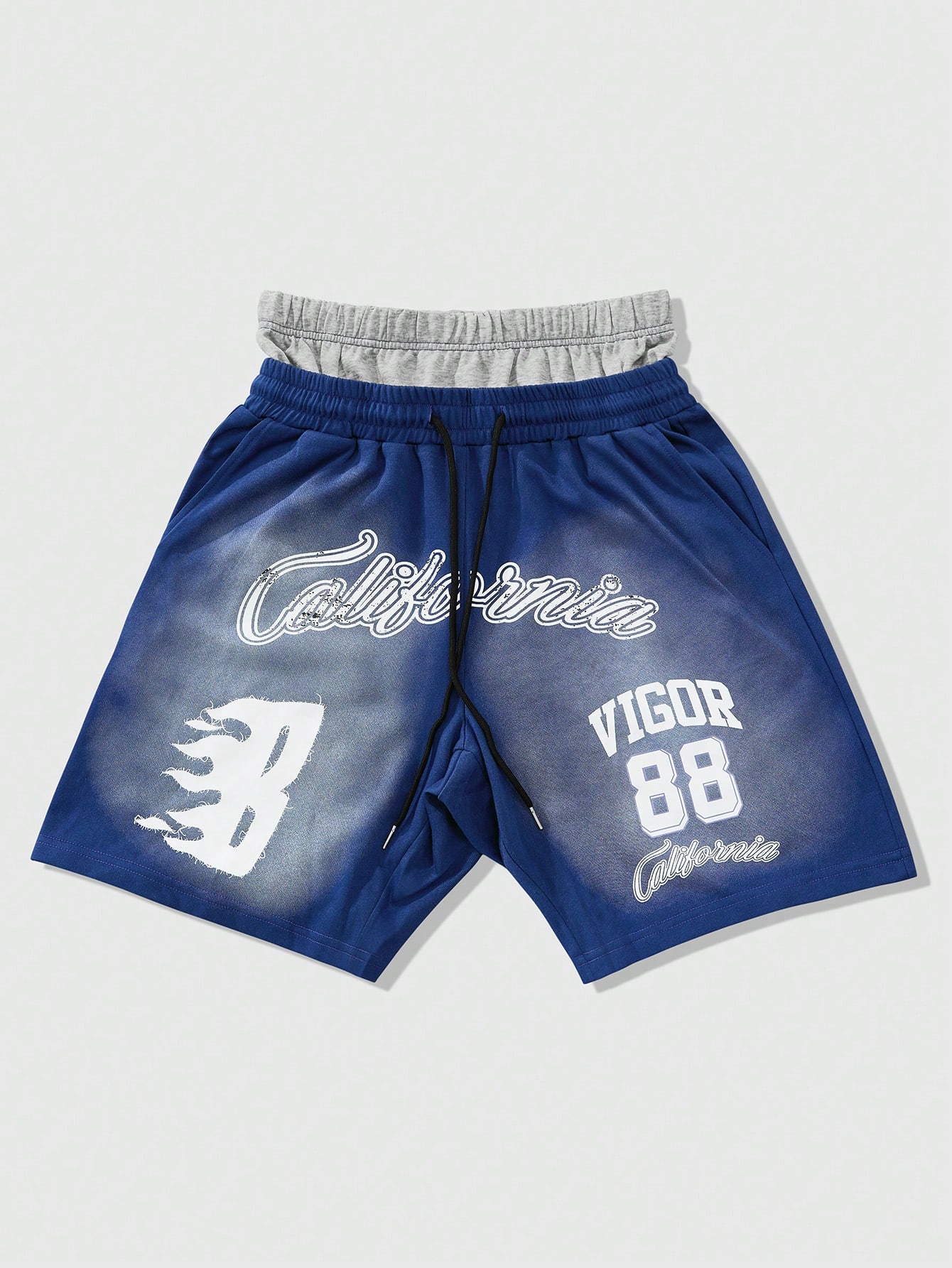 Prep Shorts para hombres de estilo callejero estadounidense con doble cintura, estampado de caballos y gráficos de letras, color blanco, con cordón elástico