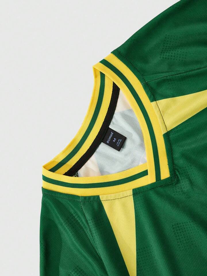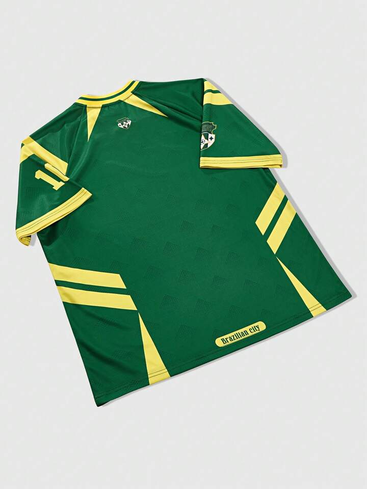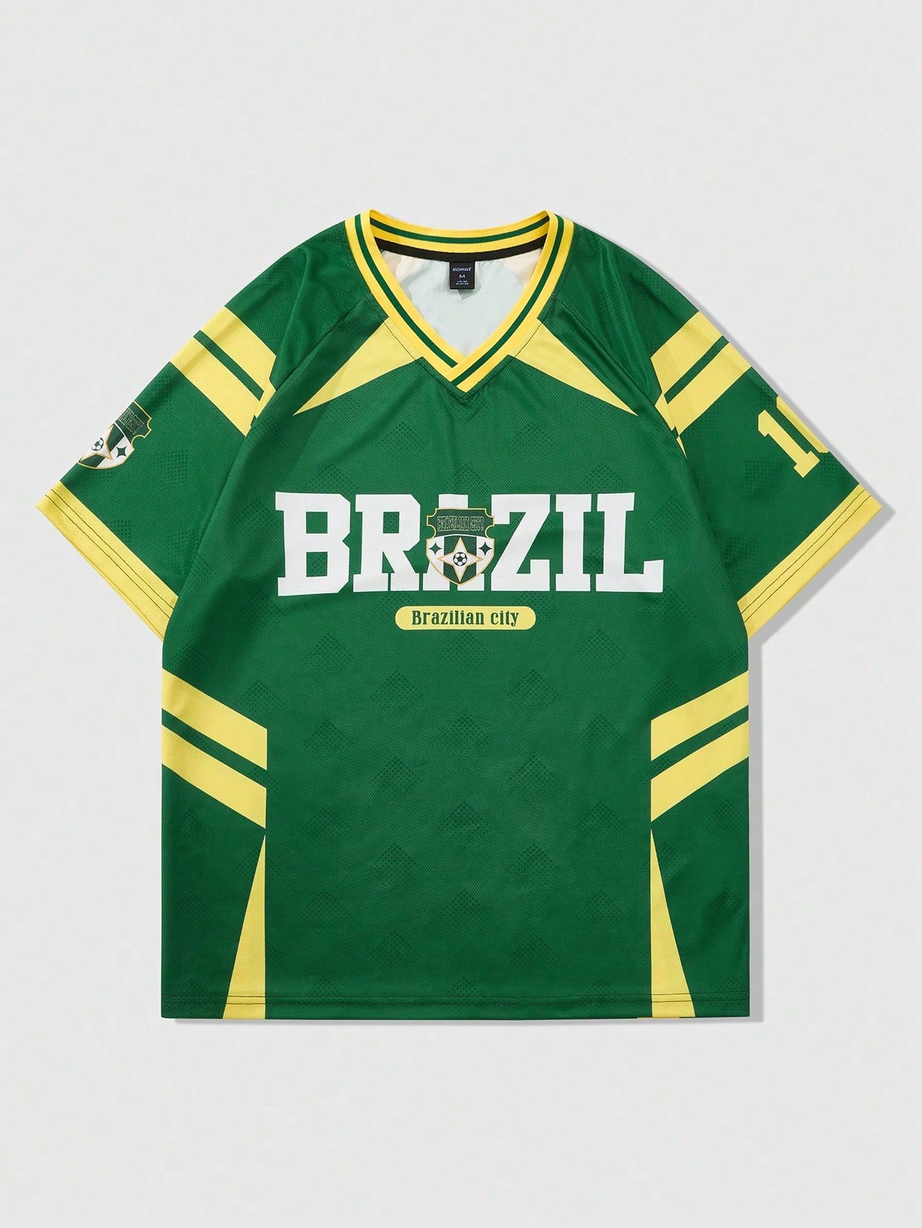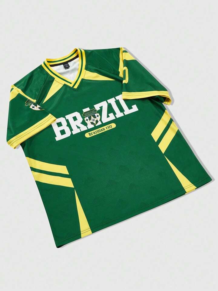 Prep Camiseta deportiva de fútbol de Brasil para hombres, camiseta casual de manga corta de estilo urbano con textura, diseño con contraste de color y logotipo de Inglaterra, cuello en V verde con texto en blanco resaltado "BRAZIL" y acentos amarillos en las mangas y los hombros