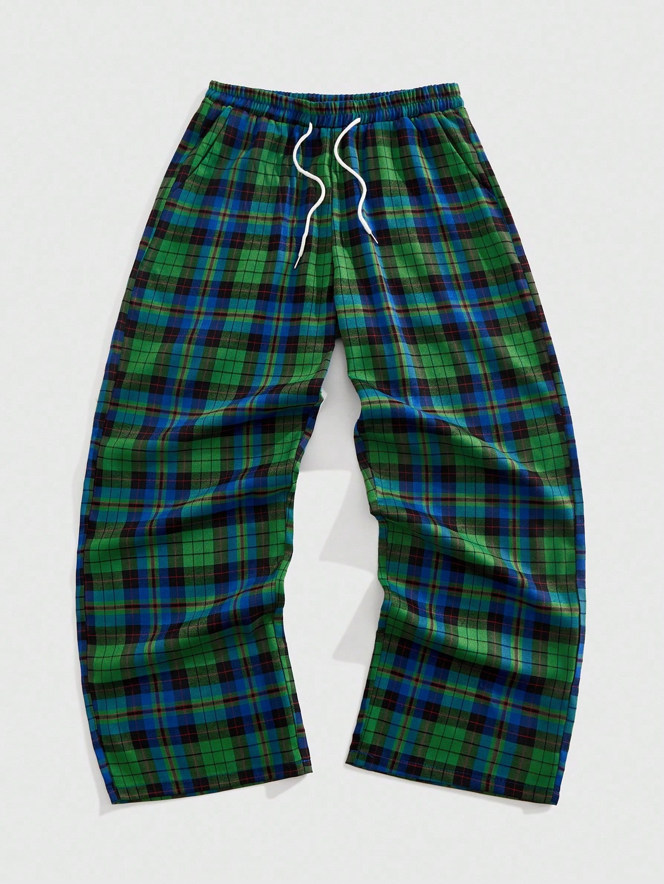 Prep Pantalones largos casuales de hombre con estampado de cuadros y cordón en la cintura, para otoño