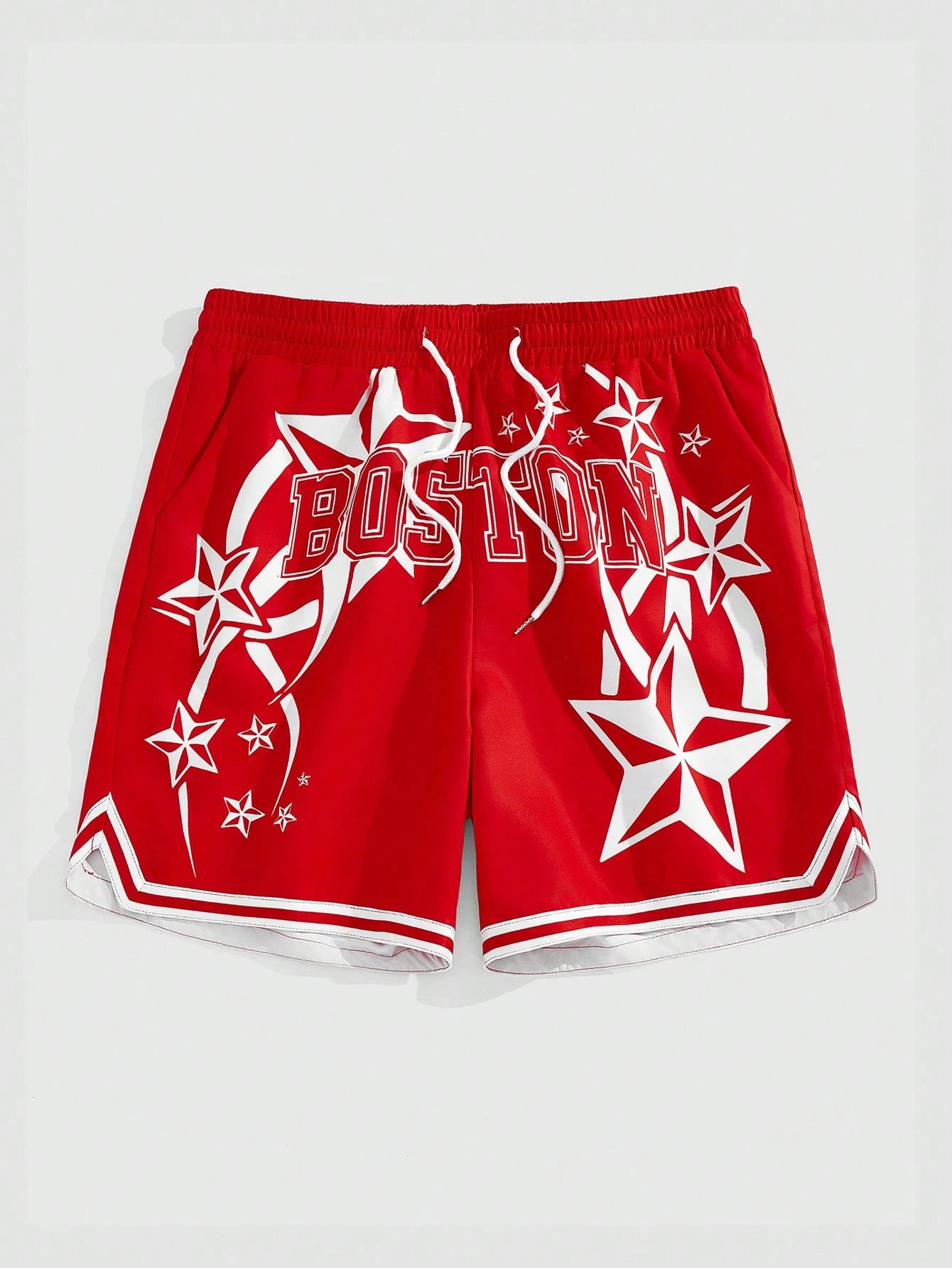 Prep Shorts informales de hombre con cintura de cordón y estampado de estrellas y letras