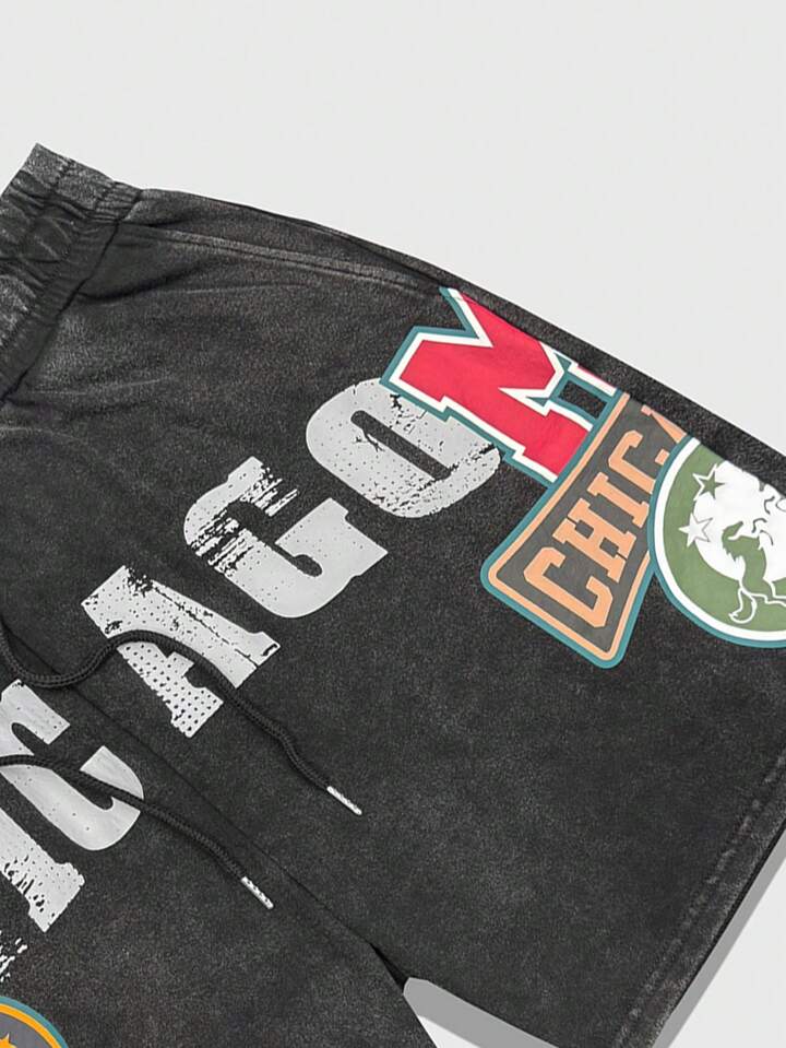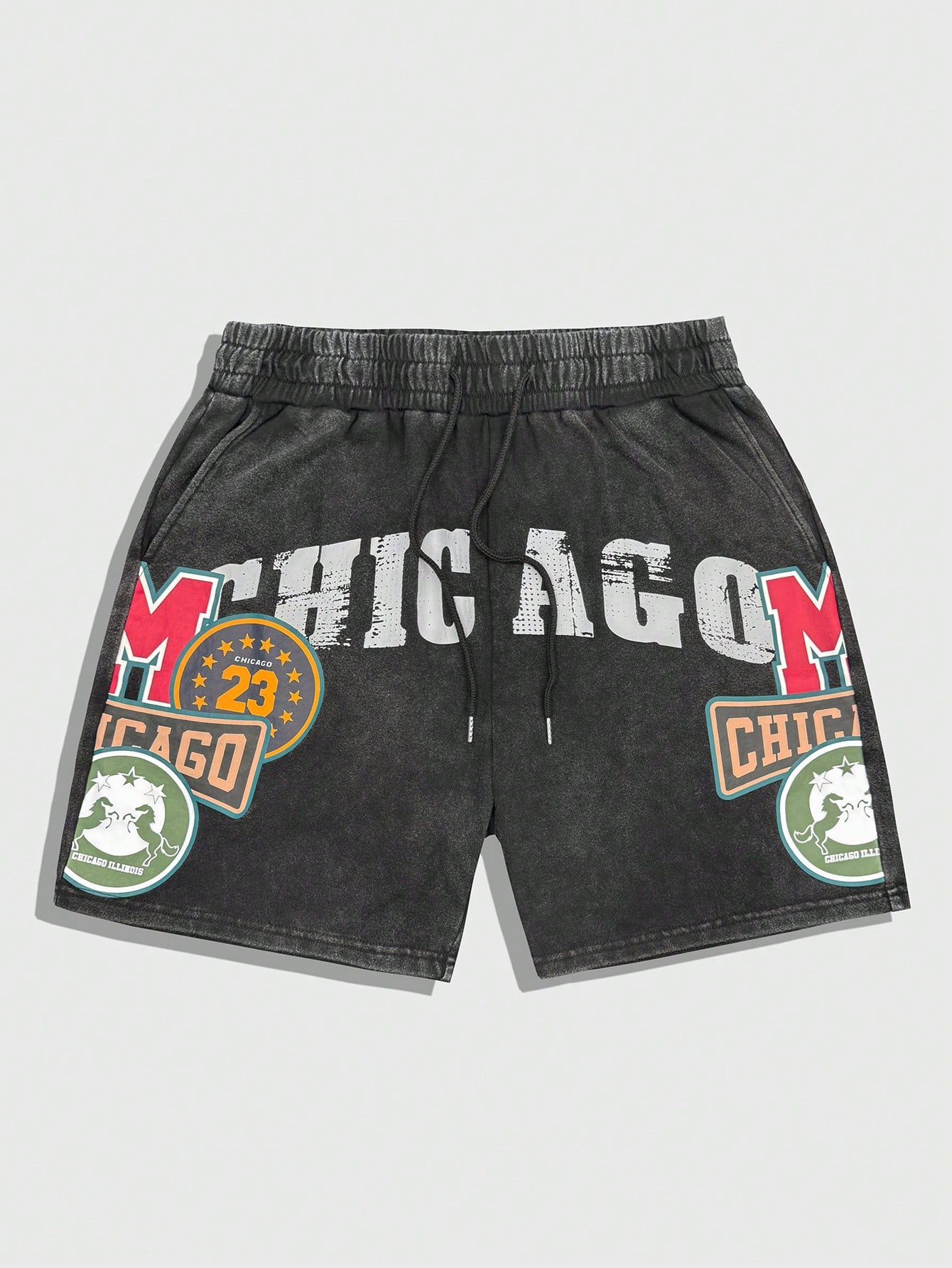Prep Shorts casuales lavados con estampado de letras para hombres en verano