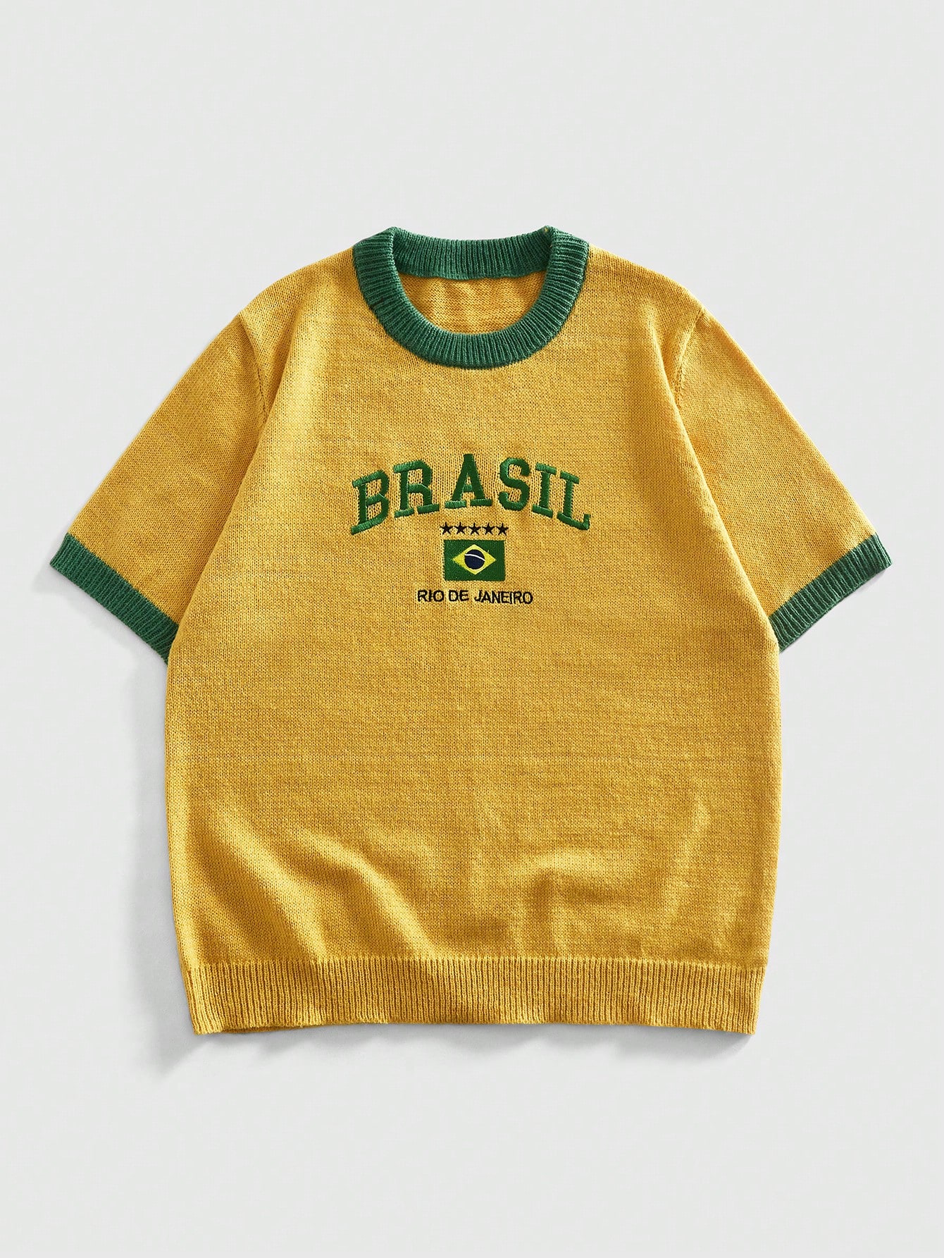 Prep Camiseta de punto de cuello redondo de manga corta con bordado de letras y ribete de contraste para hombre
