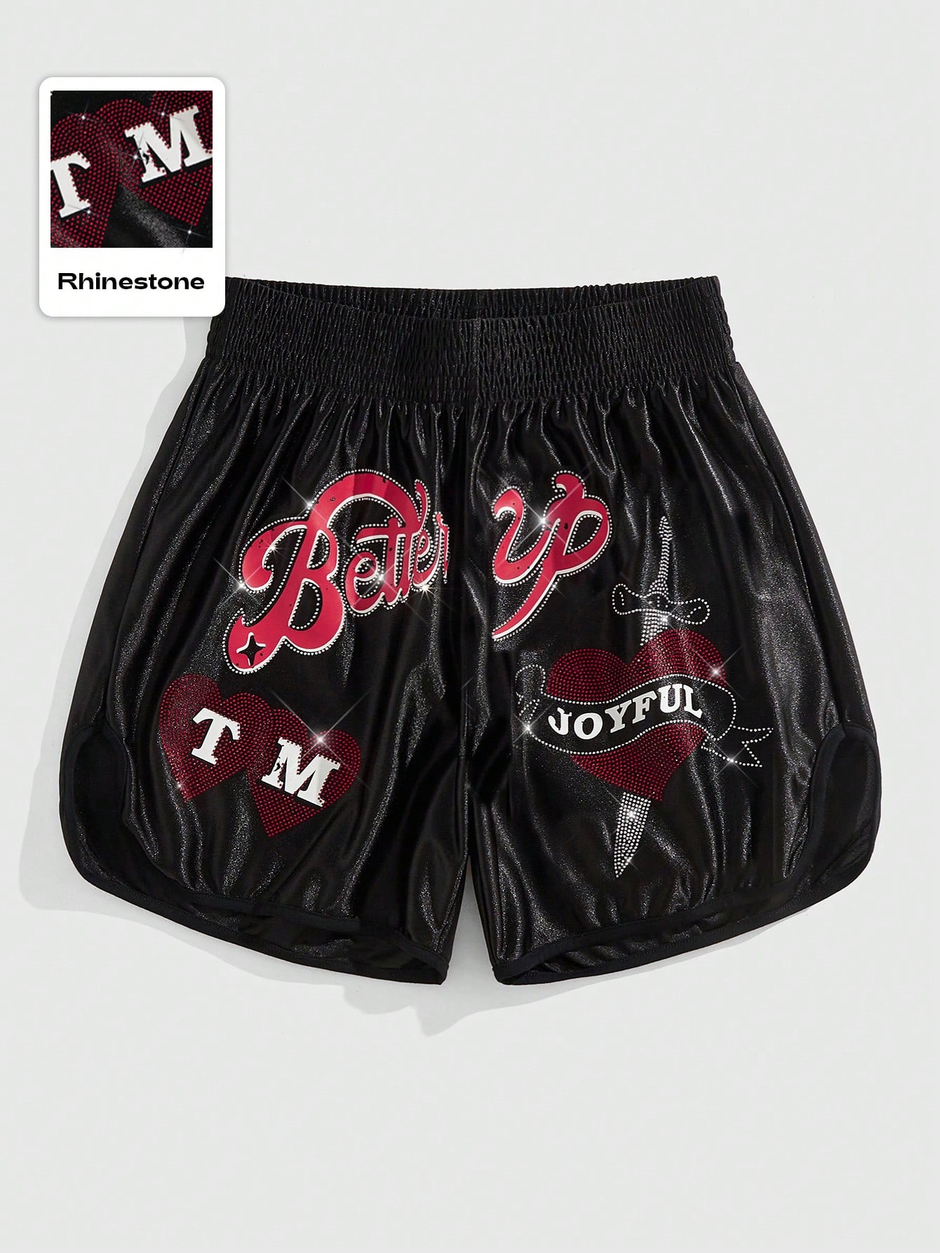 Prep Pantalones cortos de boxeo con cintura elástica, diseño casual con eslogan y decoración de strass para hombre, de verano