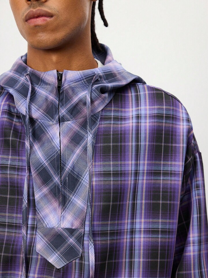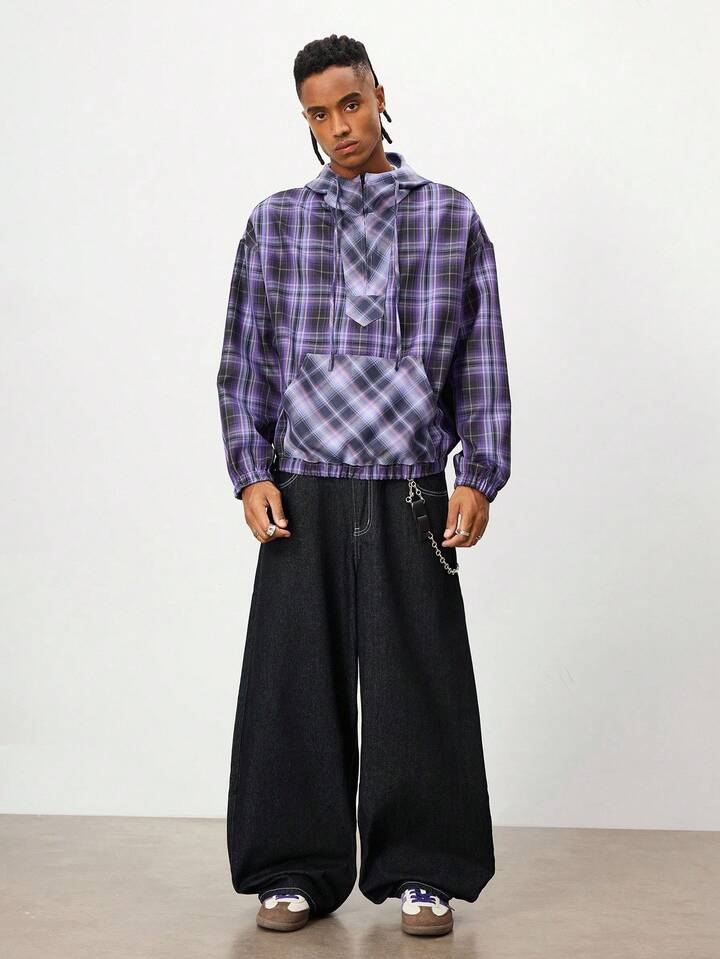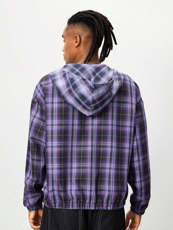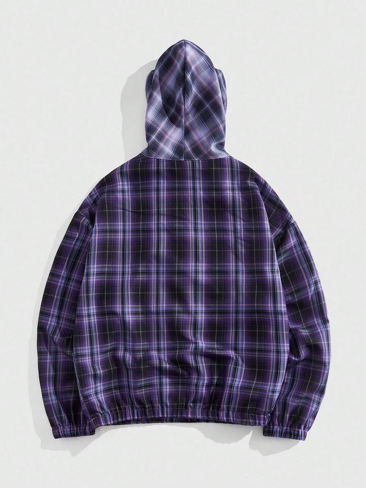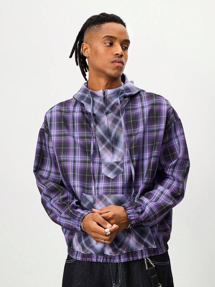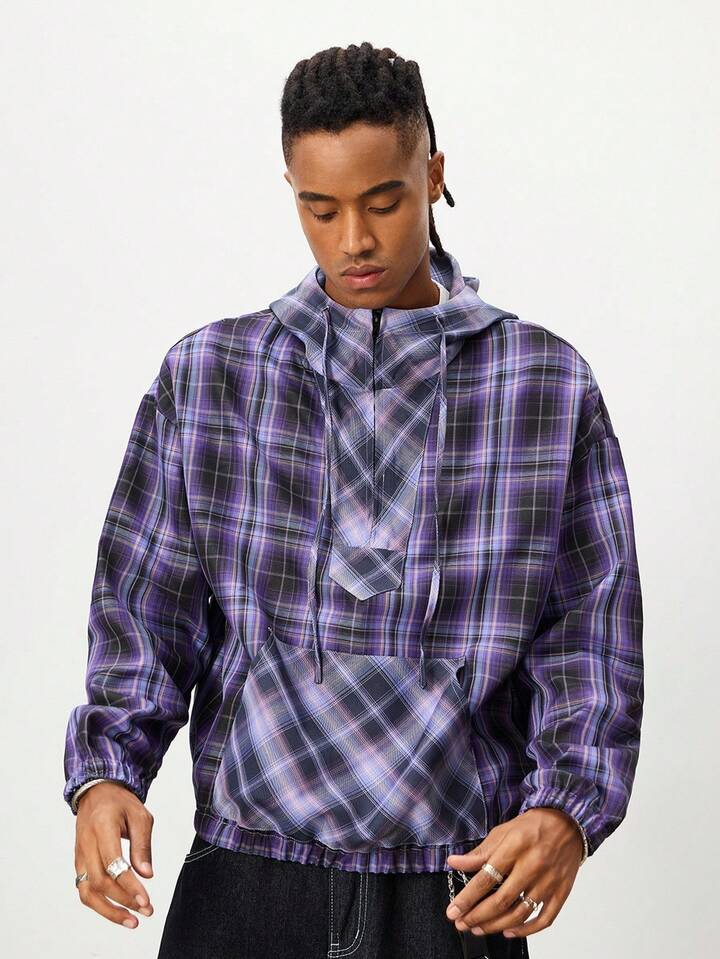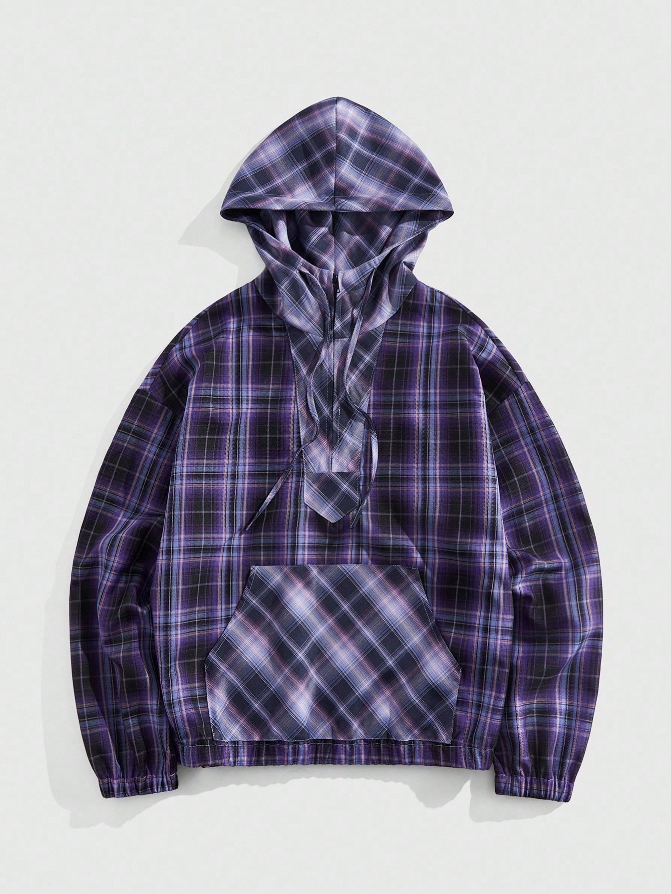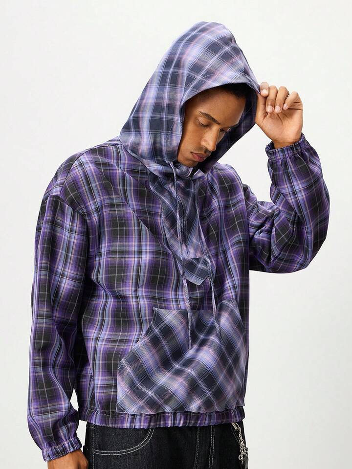 Prep Sudadera casual con capucha, bolsillo y cordón para hombre, de manga larga y diseño a cuadros