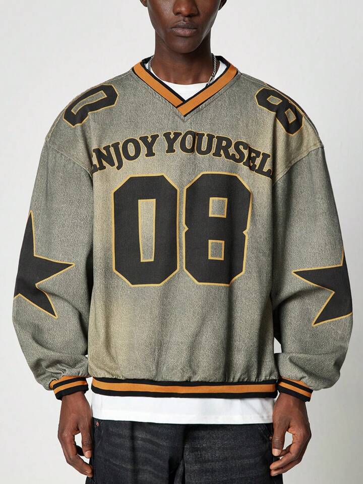 Prep Camisa vaquera casual de manga larga con cuello en V y estampado de eslogan para hombres