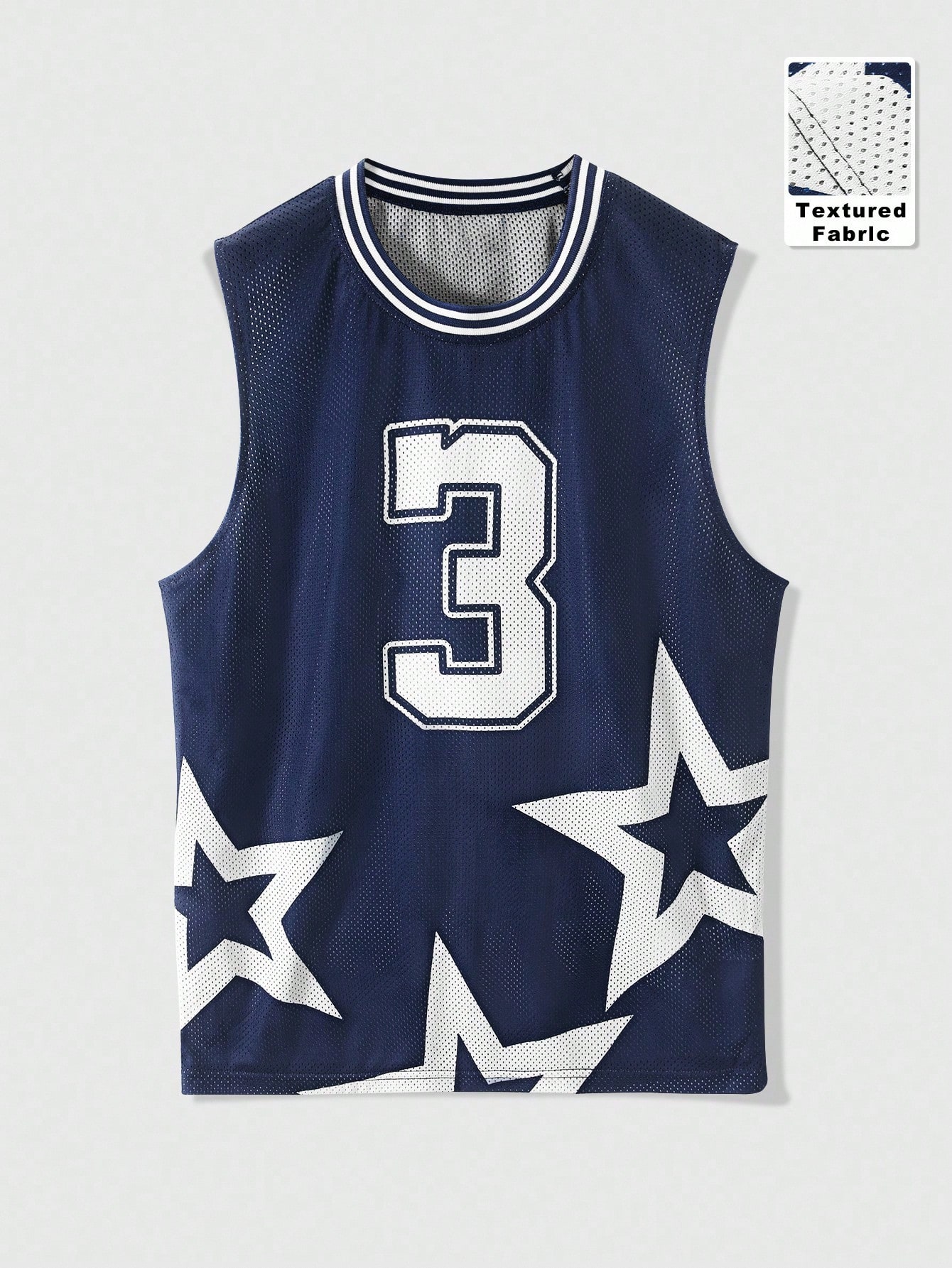 Prep Camiseta de tirantes suelta, transpirable y estampada con números y estrellas, de estilo deportivo y casual para hombre en verano