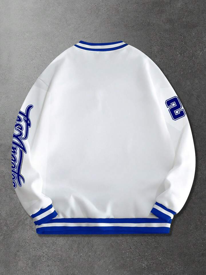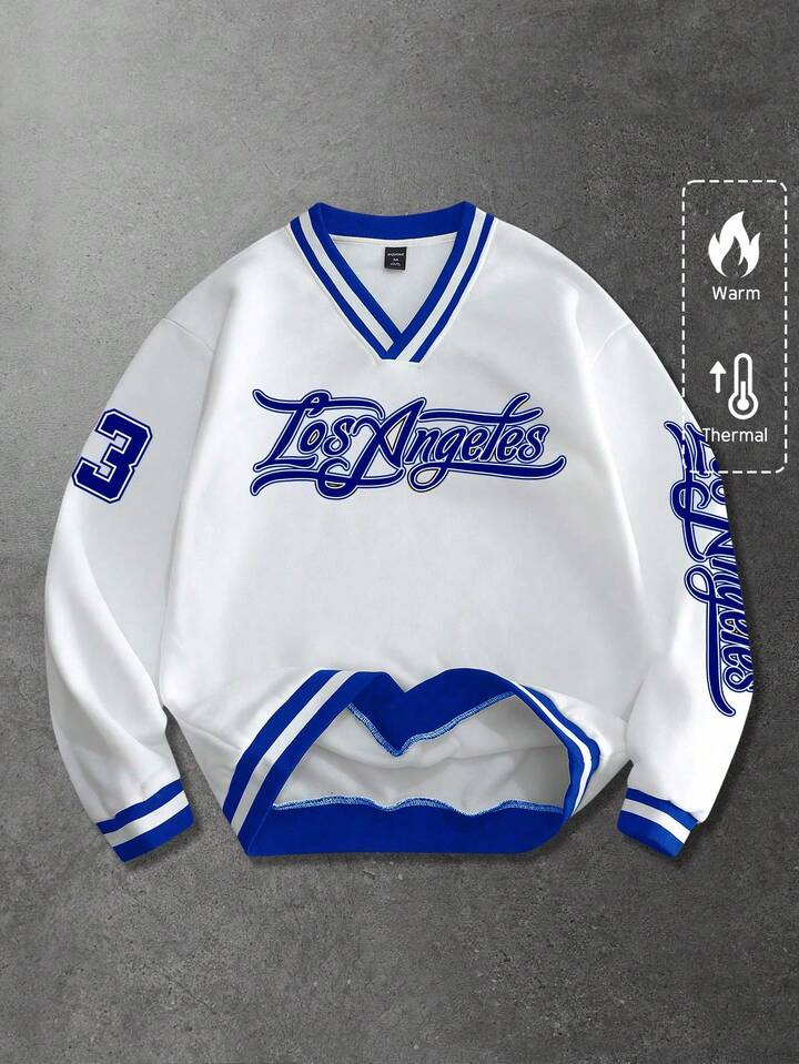 Prep Sudadera casual de manga larga con cuello en V, estampado de letras y números, versátil para el transporte diario para hombres