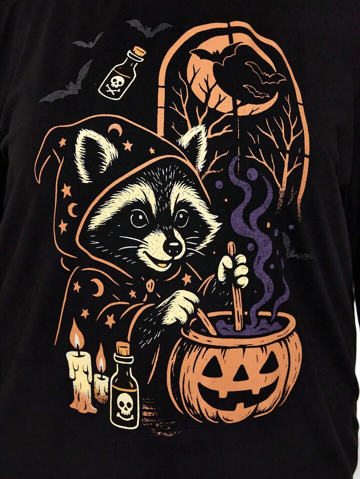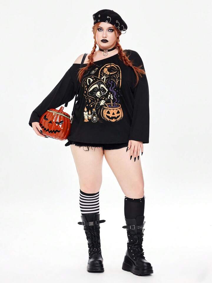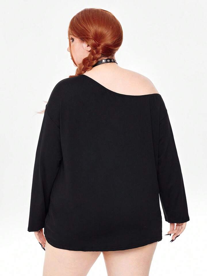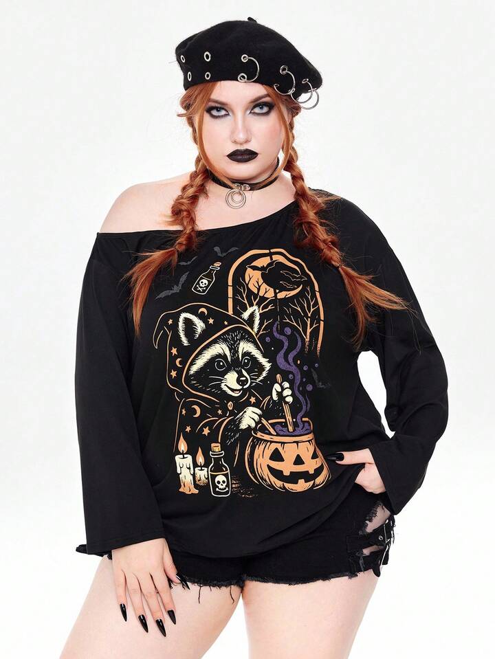 Camiseta holgada de manga larga y cuello asimétrico de color negro sólido y talla grande, con estampado de murciélago, luna y vela de calabaza, de estilo gótico, misterioso y sexy, para Halloween