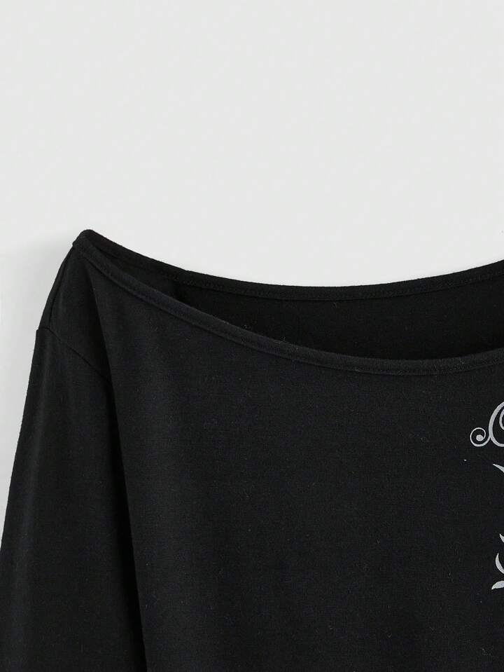 Camiseta asimétrica de hombro con estampado de cruz abisinia con cristales de estilo punk