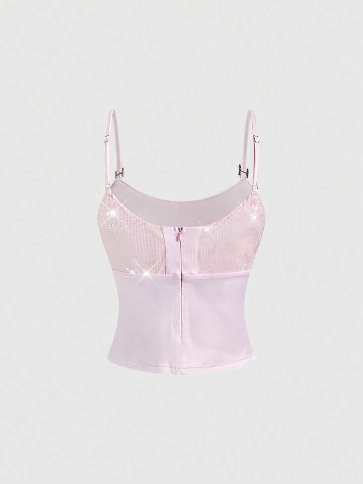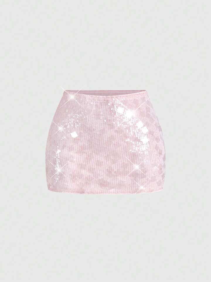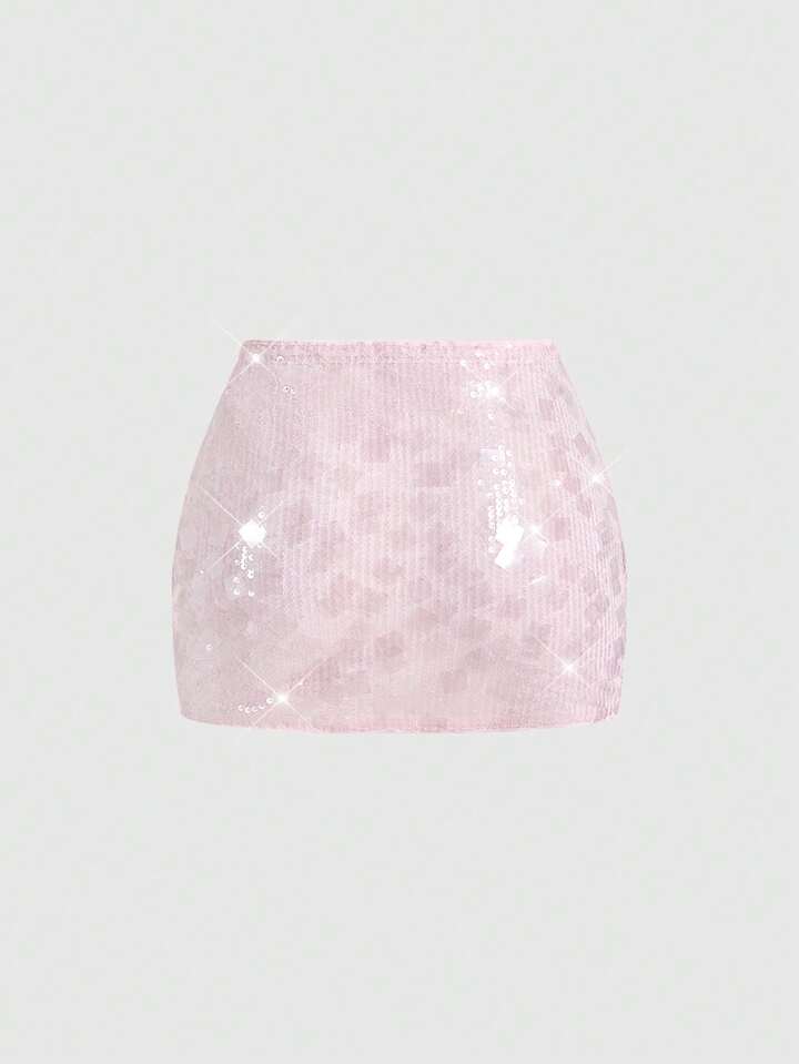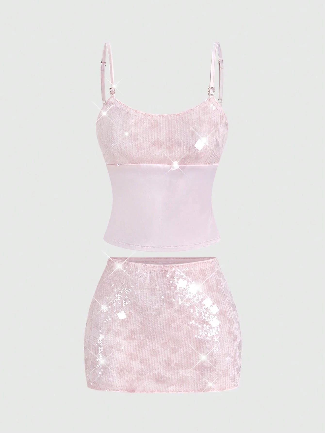 ROMWE Avant Set de 2 piezas de lentejuelas brillantes con flecos elásticos de satén ajustado y elegante para clubes nocturnos para mujeres