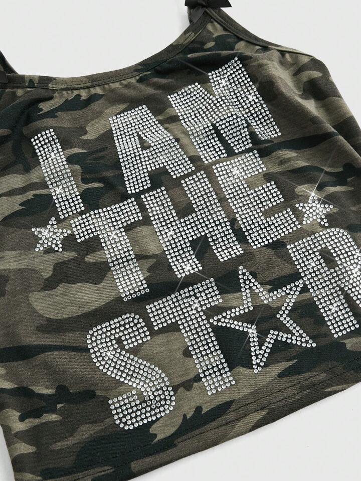 ROMWE Avant Set de 2 piezas para mujer que incluye top corto sexi tipo cami y shorts de camuflaje de cintura baja decorados con rhinestones, estilo Y2K