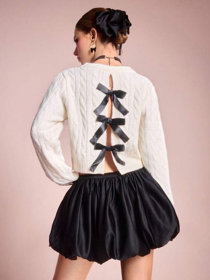 ROMWE Avant Suéter holgado y casual con lazo calado único para mujer, para otoño/invierno
