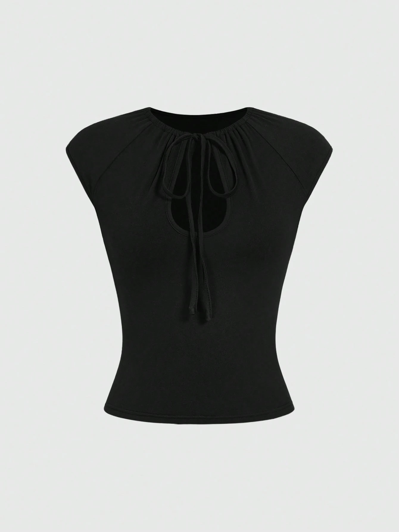 ROMWE Avant Camiseta de mujer con escote de pico y diseño calado, de estilo casual y vanguardista