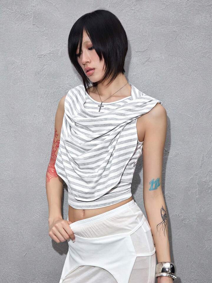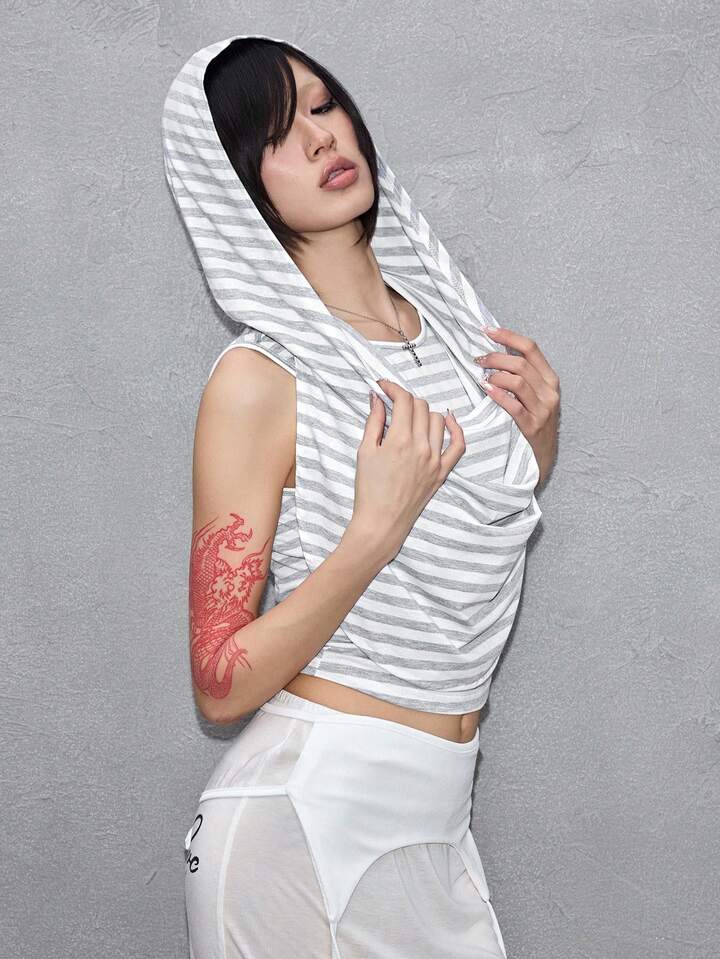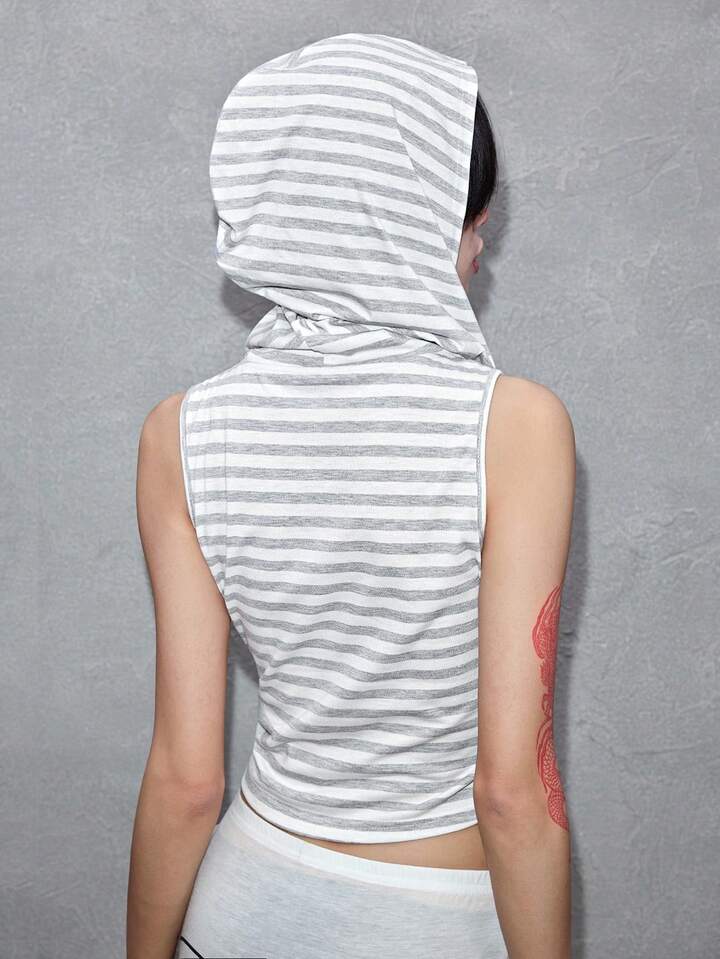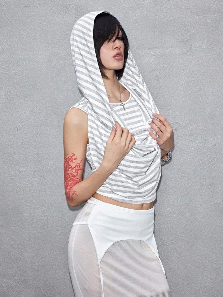 ROMWE Avant Sudadera con capucha de cuello alto a rayas Avant, top corto de estilo streetwear Y2K para mujeres