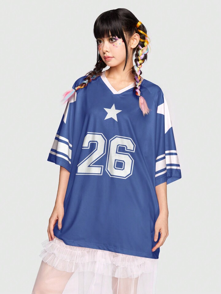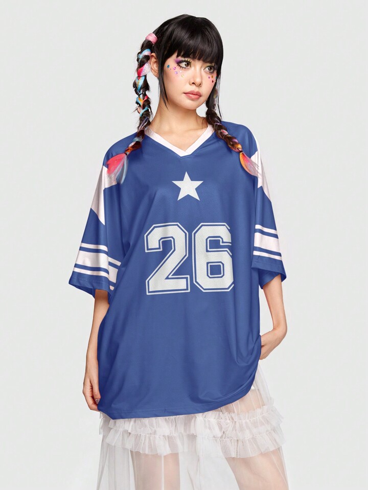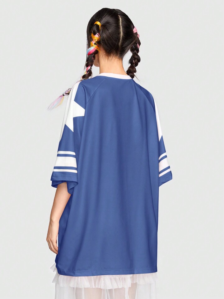 ROMWE Avant Camiseta de manga corta casual con estampado de estrellas y números, para la escuela