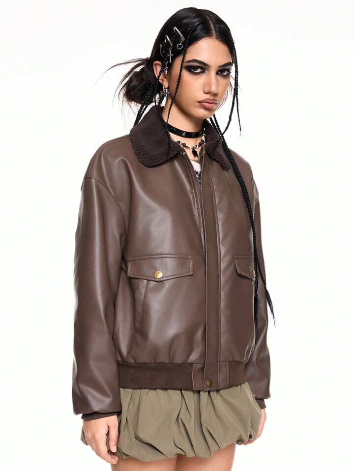 ROMWE Avant Chaqueta baseball de manga larga con cuello de piel sintética para mujer, Downtown Girl, para otoño/invierno