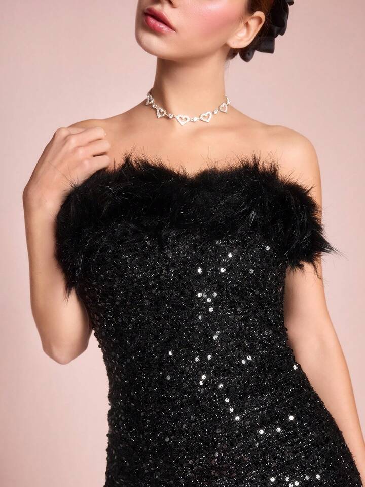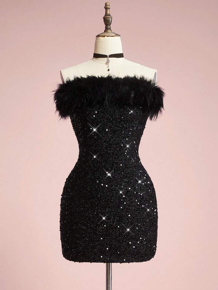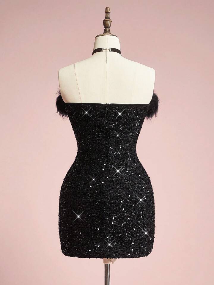 ROMWE Avant Vestido mini ajustado con cuello de piel y adornos de lentejuelas, elegante vestido de fiesta sexy
