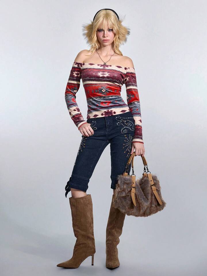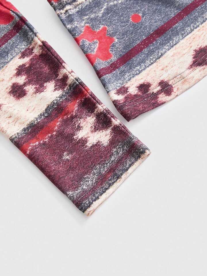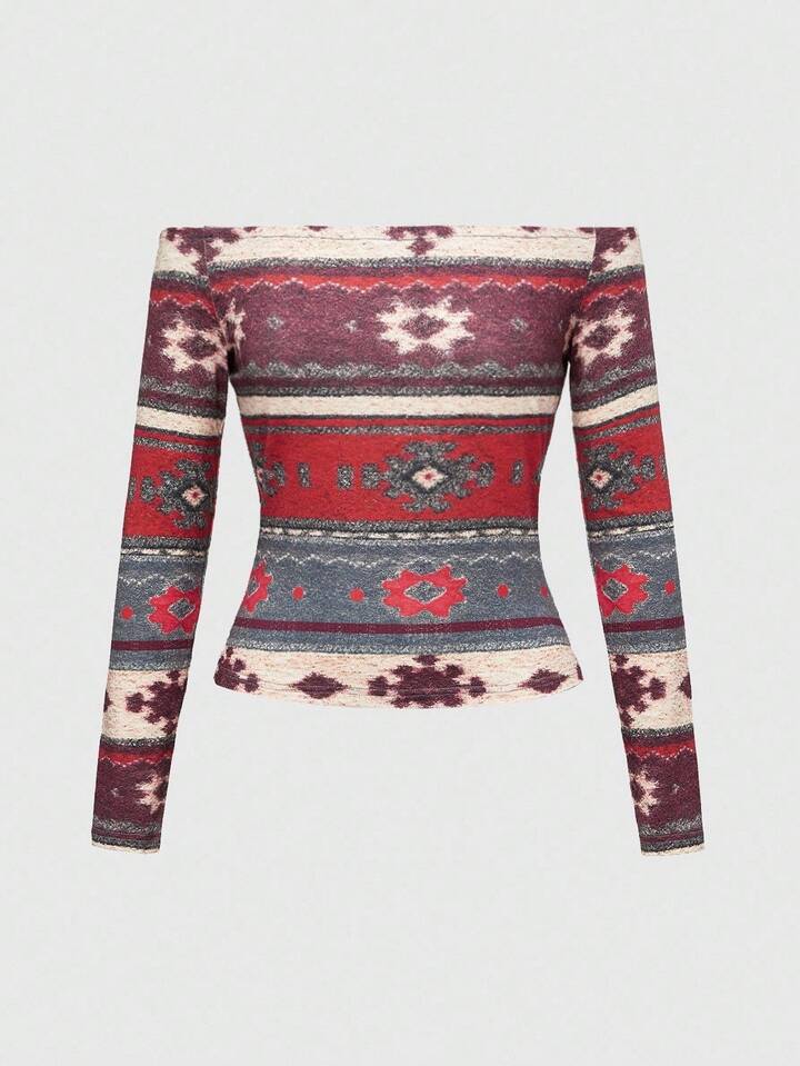 ROMWE Avant Camiseta de mujer de manga larga con estampado de Fairisle y patchwork de punto