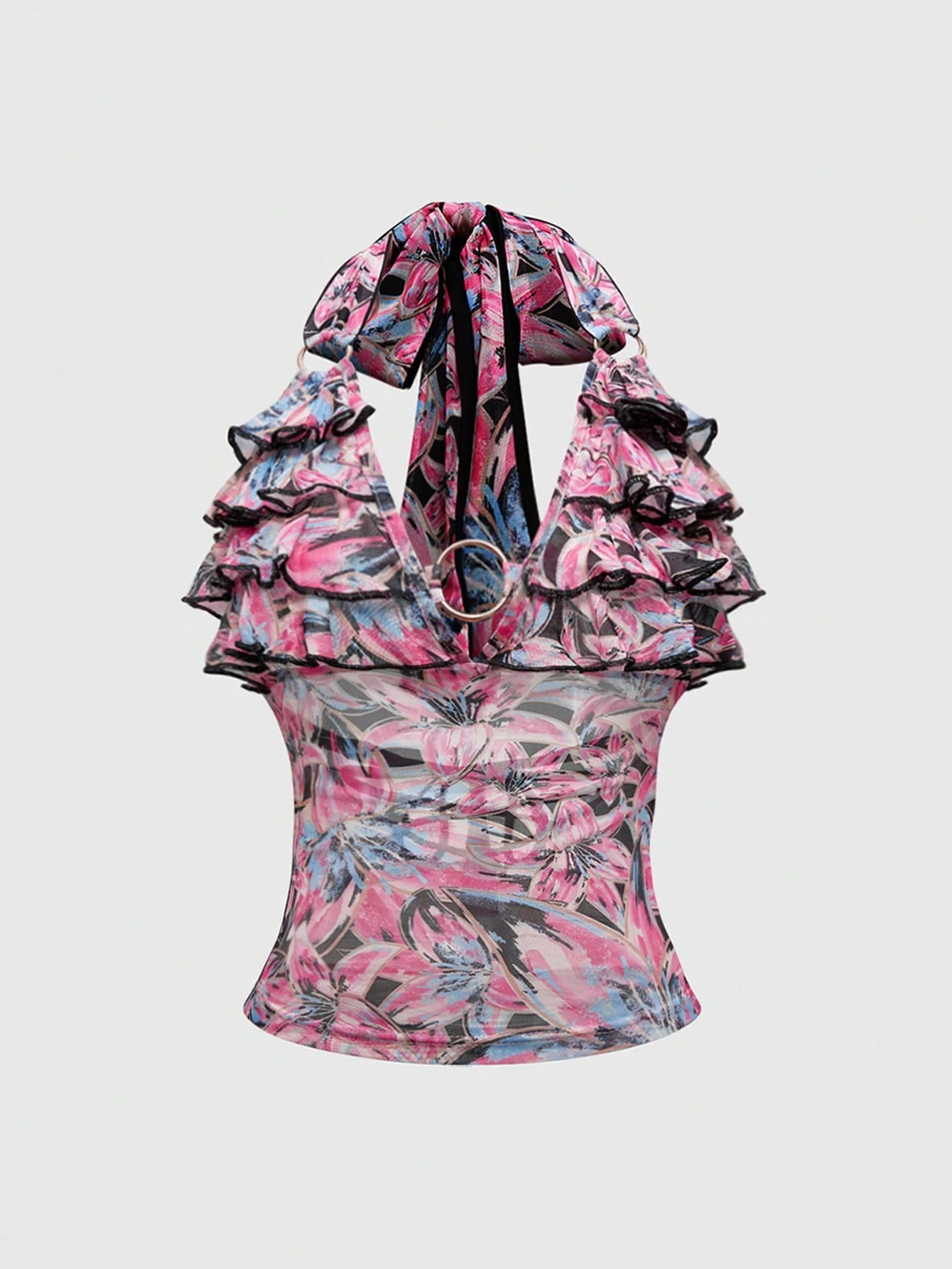 ROMWE Avant Top de tirantes con estampado floral, encaje de contraste, cordón en el cuello, volantes multicapa en el dobladillo para vacaciones y playa de mujer