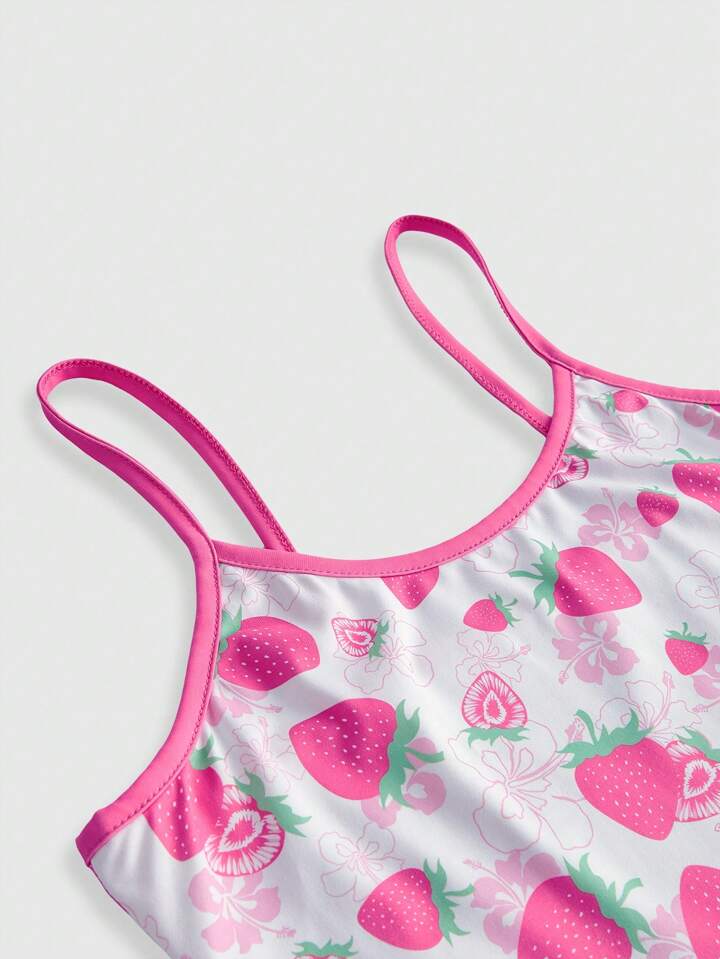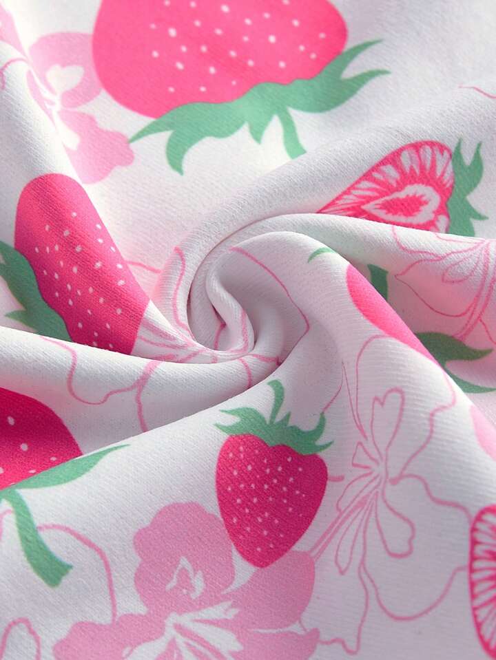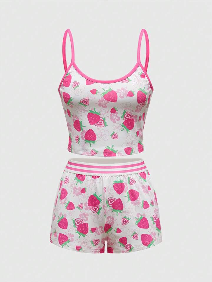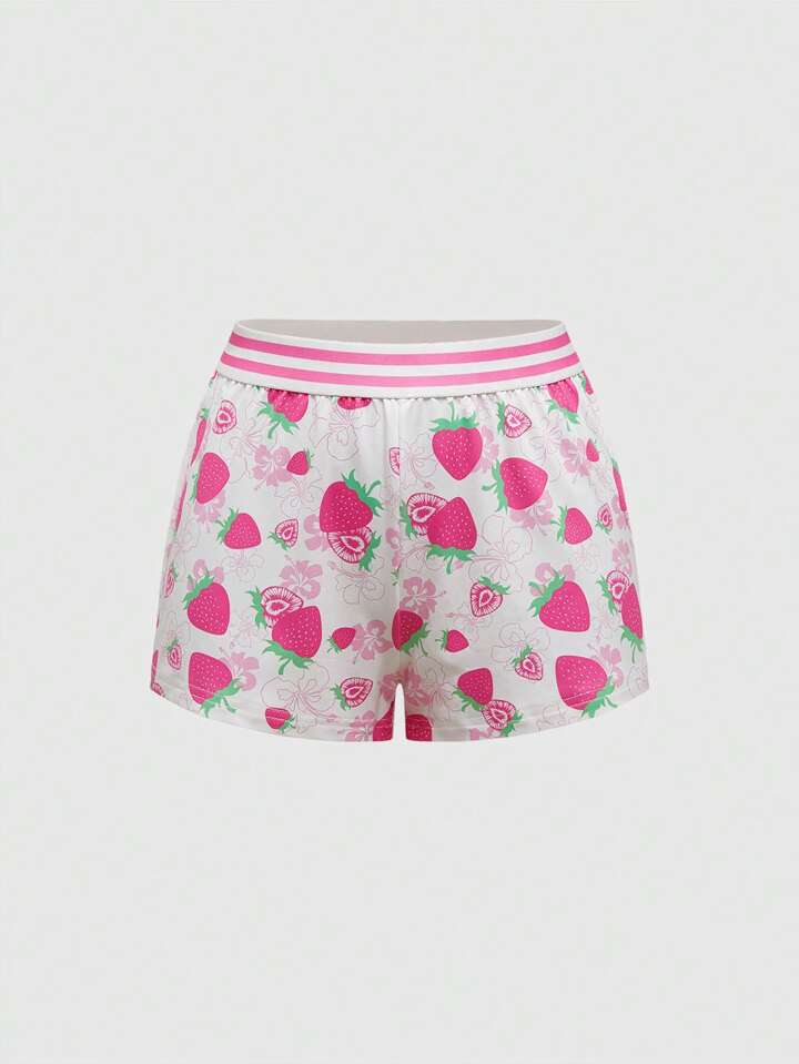 ROMWE Avant Short casual súper corto con estampado de hibisco y fresa, conjunto de pijama de verano "Island Girl"