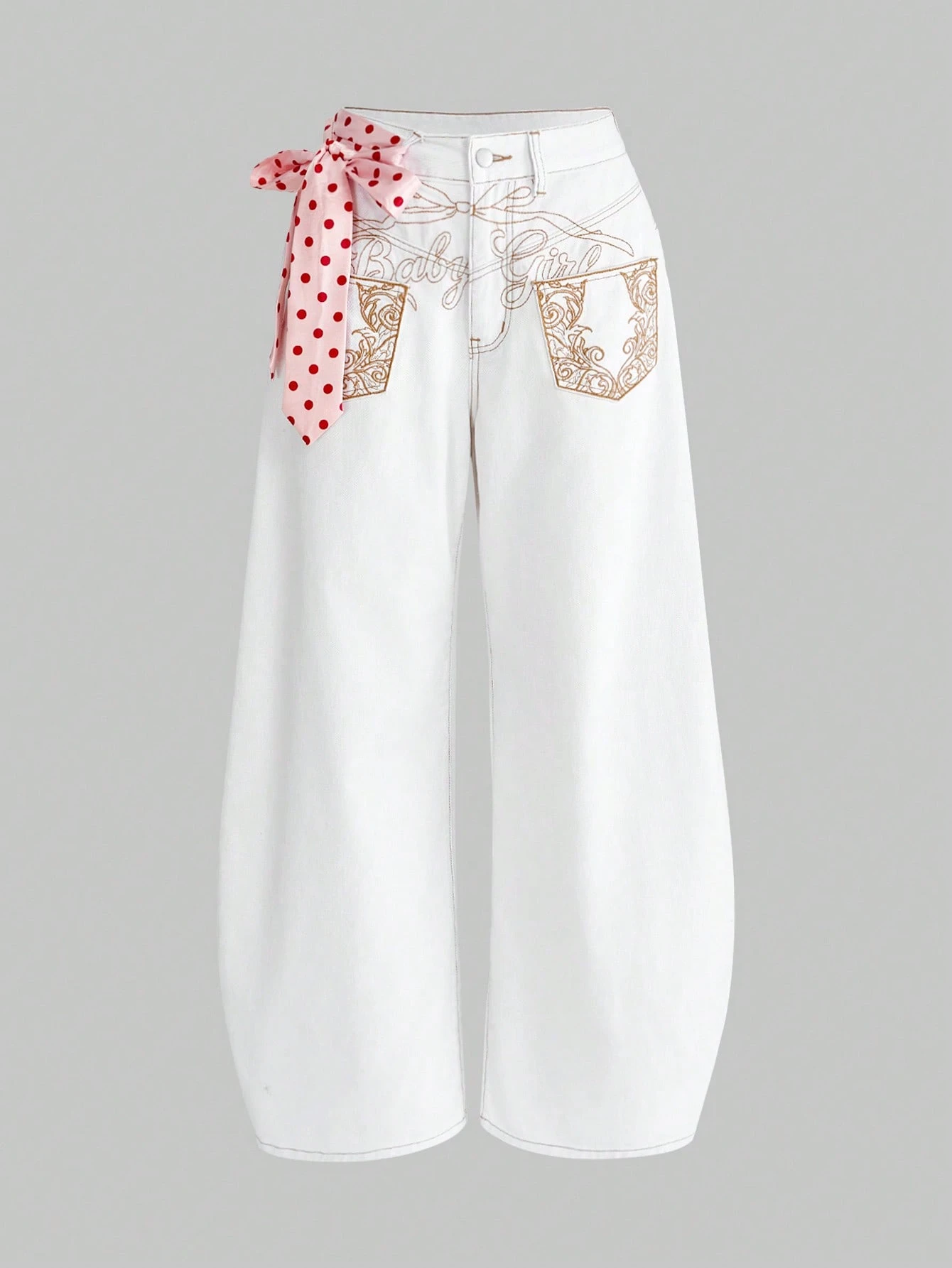 ROMWE Avant Jeans acampanados de cintura baja con bordado y atar