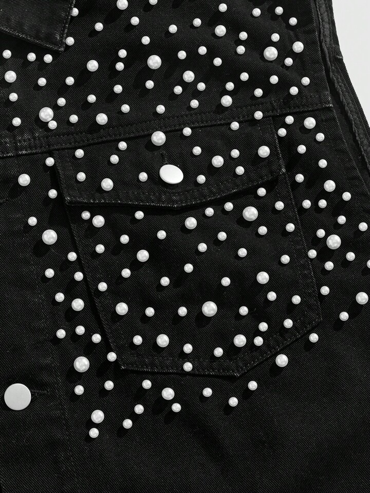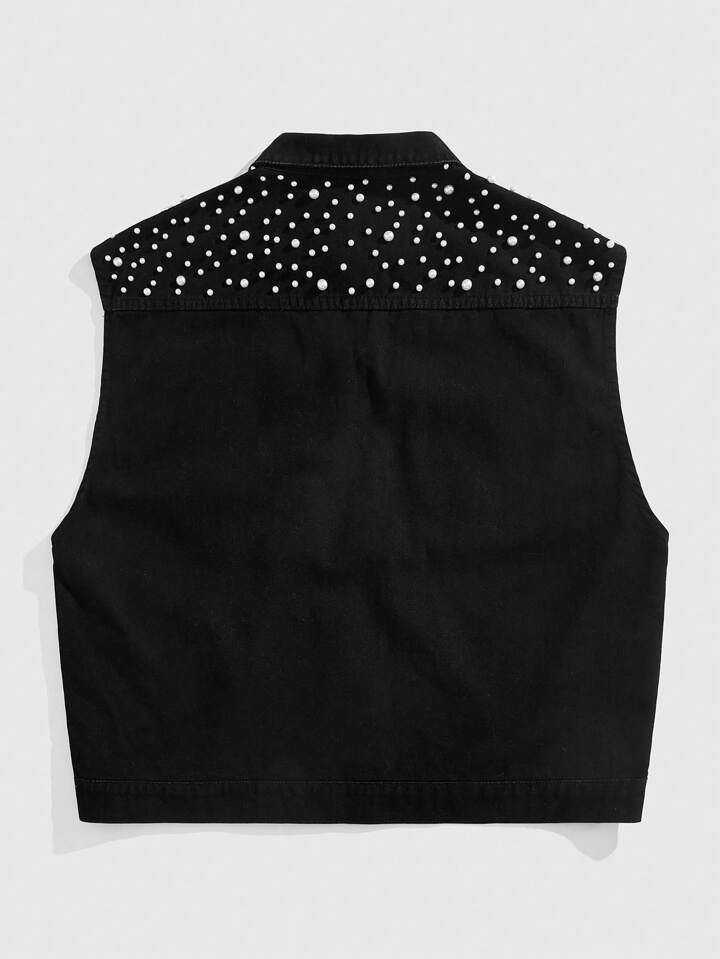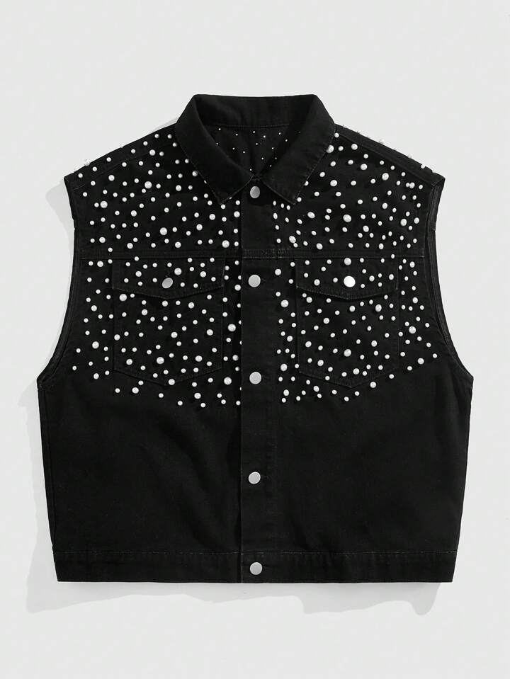 ROMWE Avant Chaleco vaquero de una sola hilera con perlas falsas negras para hombre
