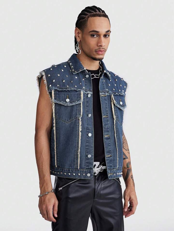 ROMWE Avant Chaqueta de mezclilla informal para hombres con adornos deshilachados y remaches, verano, escuela
