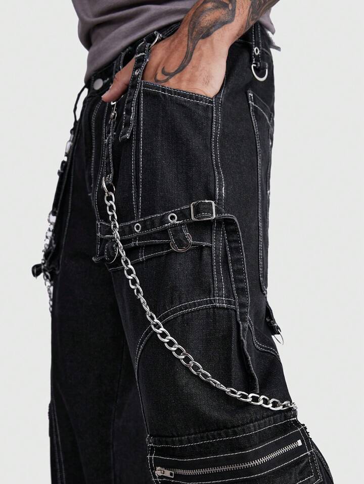 ROMWE Avant Pantalones vaqueros de tela vaquera con botones delanteros, múltiples bolsillos, cremallera y cadena decorativa para hombre, uso casual diario