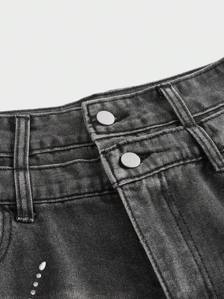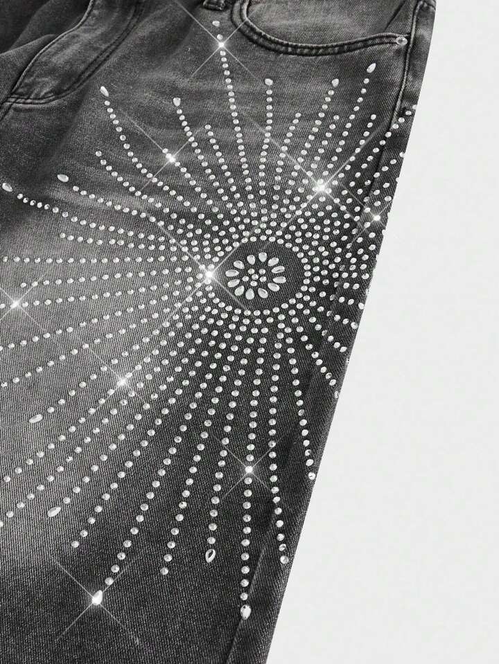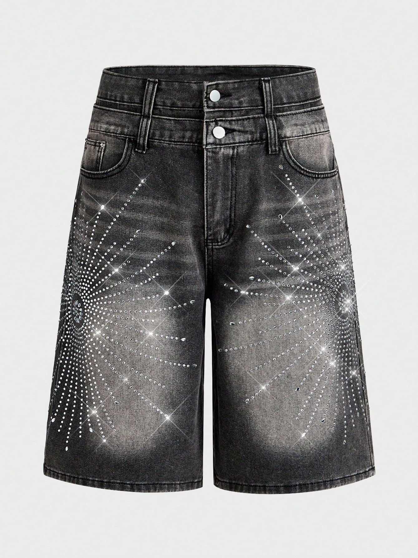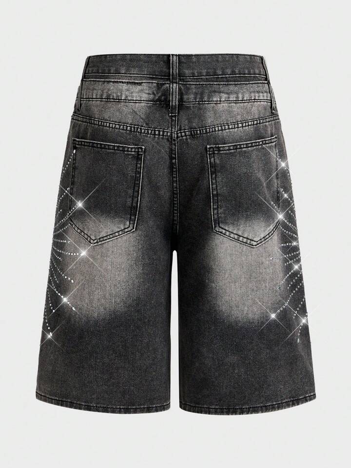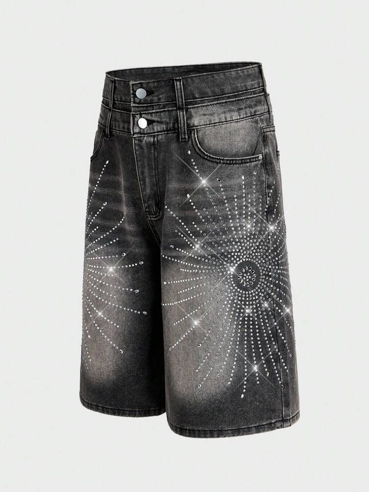 ROMWE Avant Shorts vaqueros de hombre con estampado de diamantes brillantes y doble capa en la cintura