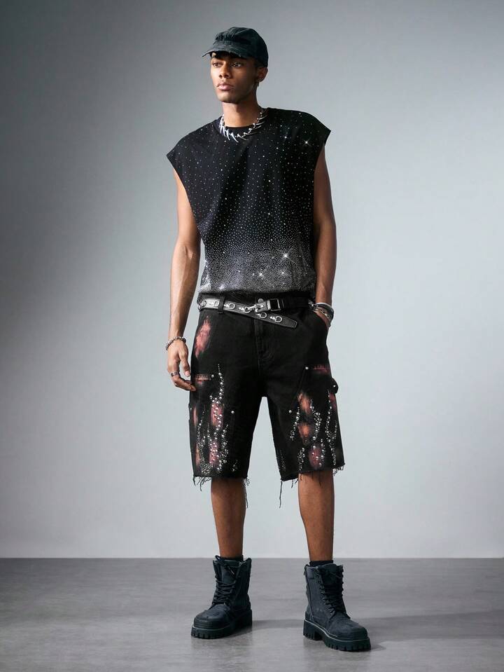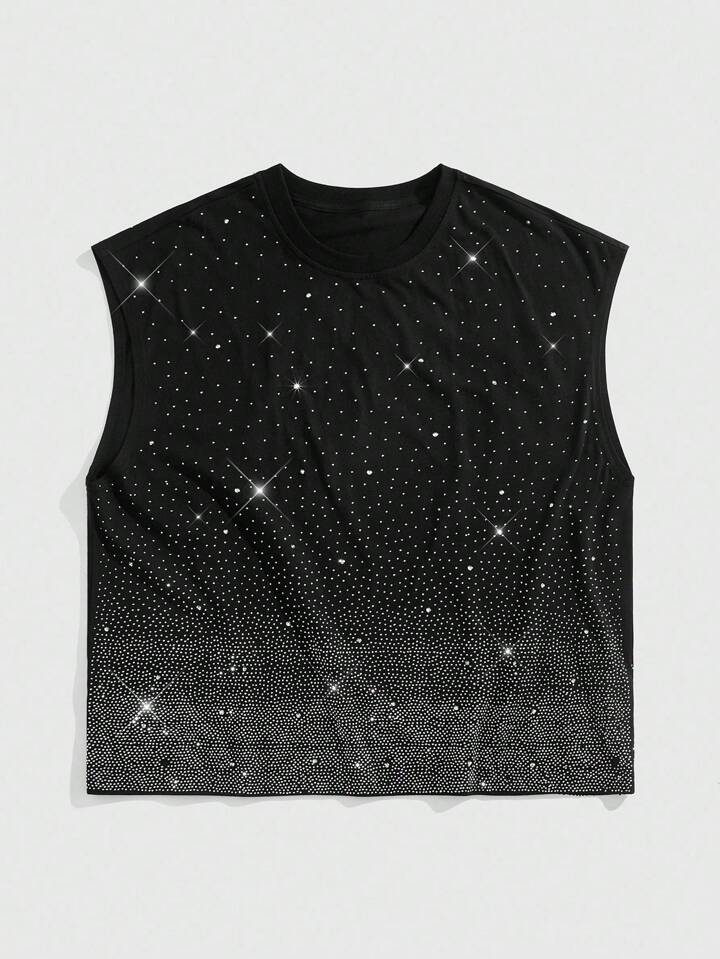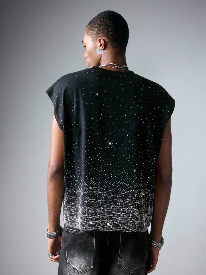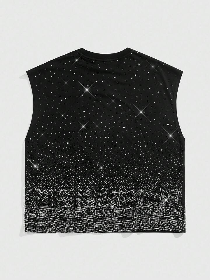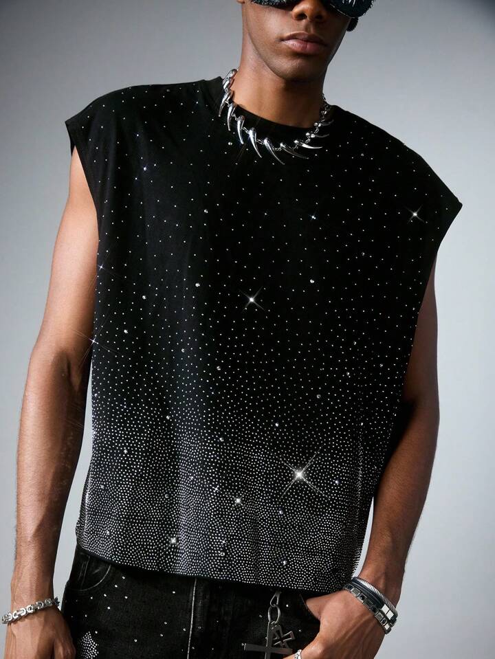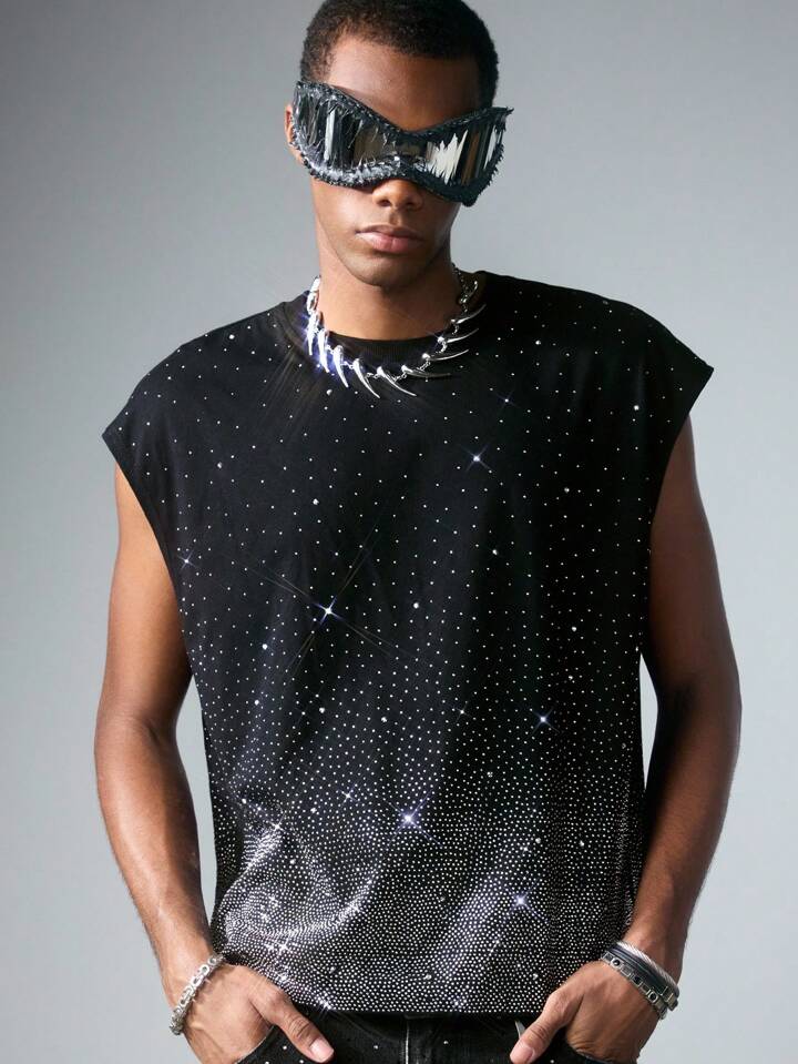 ROMWE Avant Camiseta sin mangas casual y holgada con estampado de diamantes brillantes y cuello redondo para hombre