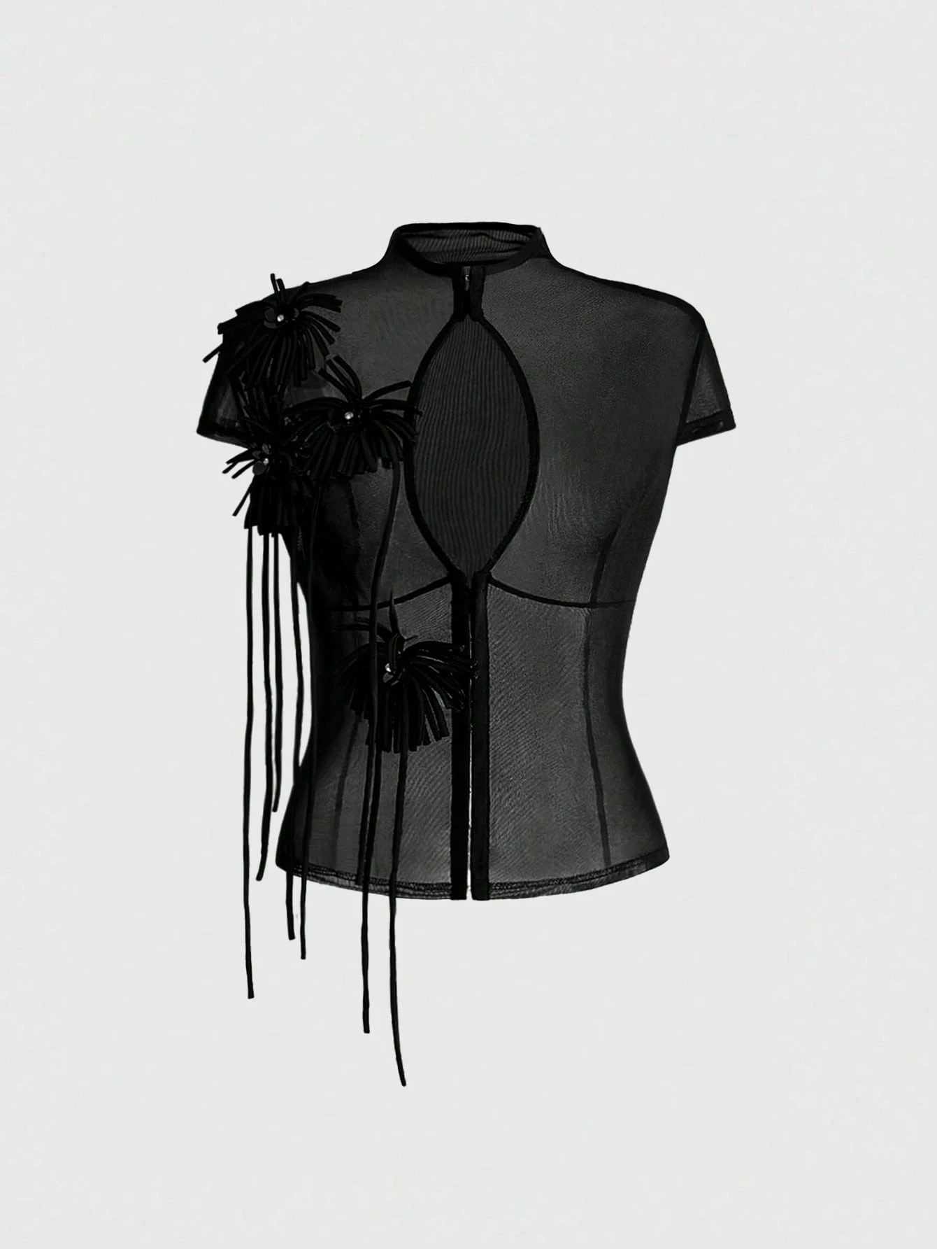 ROMWE Avant Nueva blusa de mujer con cuello Mao, ajustada y transparente, con decoración floral 3D de estilo chino