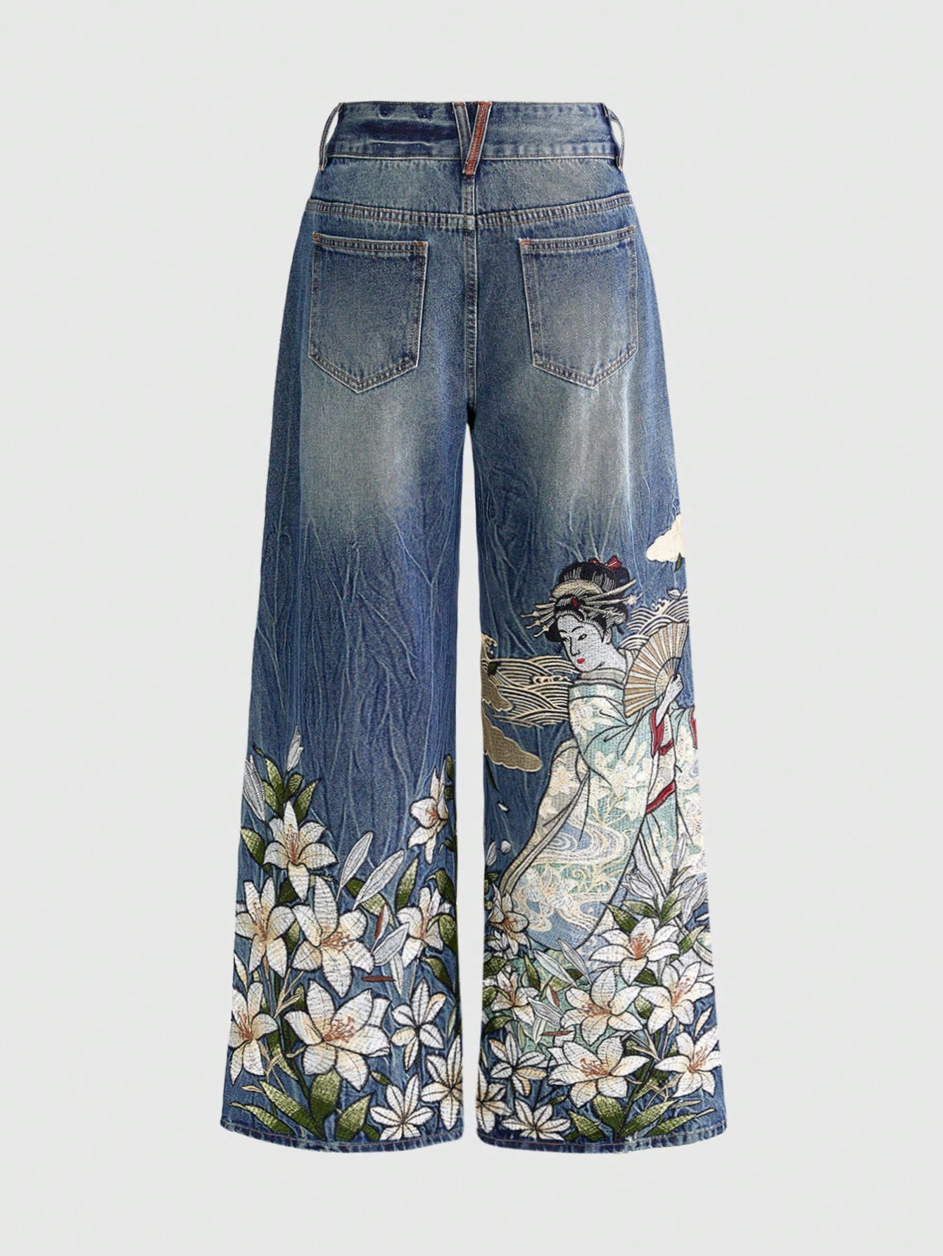 ROMWE Avant Nuevos jeans retro de cintura baja con bordado de geisha y lirio al estilo chino para mujeres