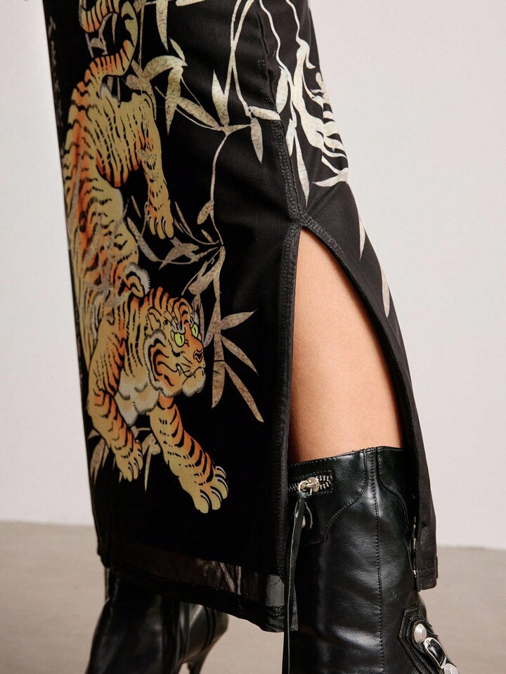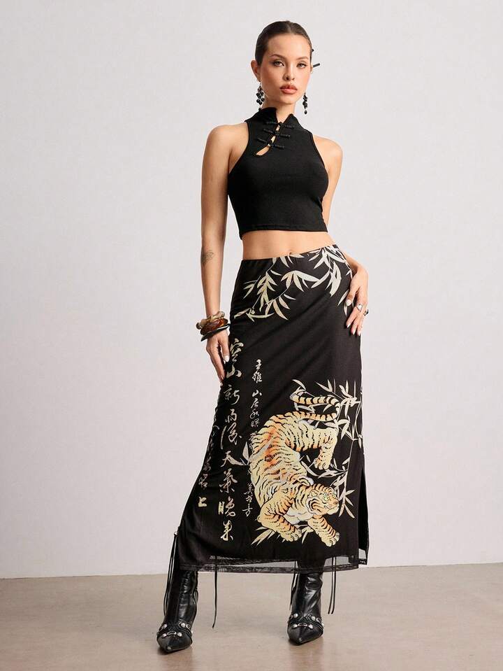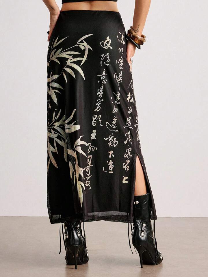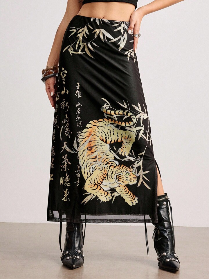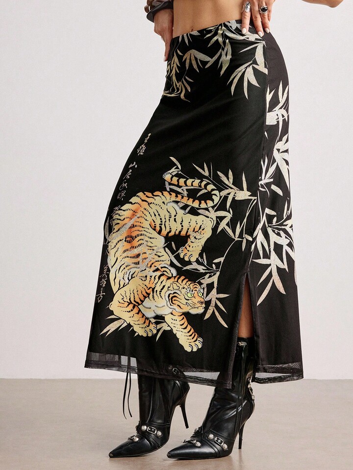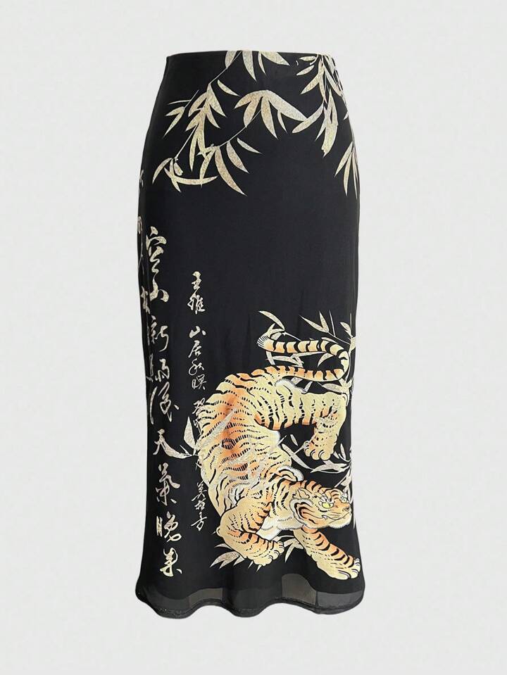 ROMWE Avant Nueva falda de mujer con estampado de caligrafía de tigre y hoja de bambú al estilo chino con bajo con abertura