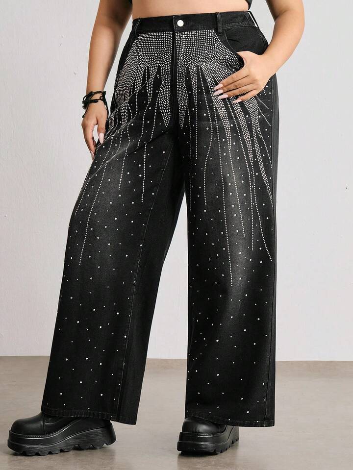 ROMWE Avant Jeans casuales de pierna ancha con bolsillos con decoración de strass para talla grande