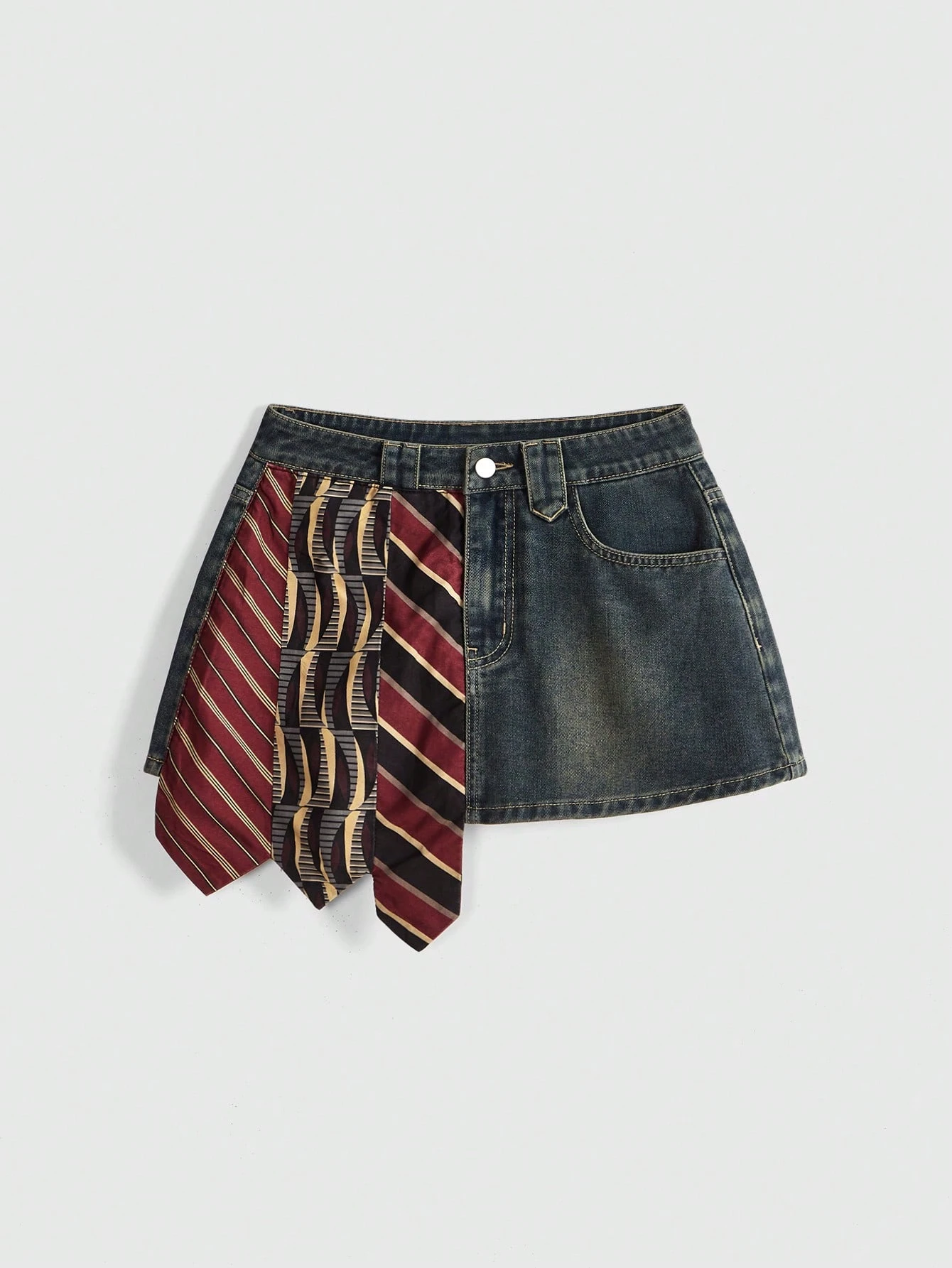 ROMWE Avant Minifalda de mezclilla de cintura baja con estilo universitario retro para mujer