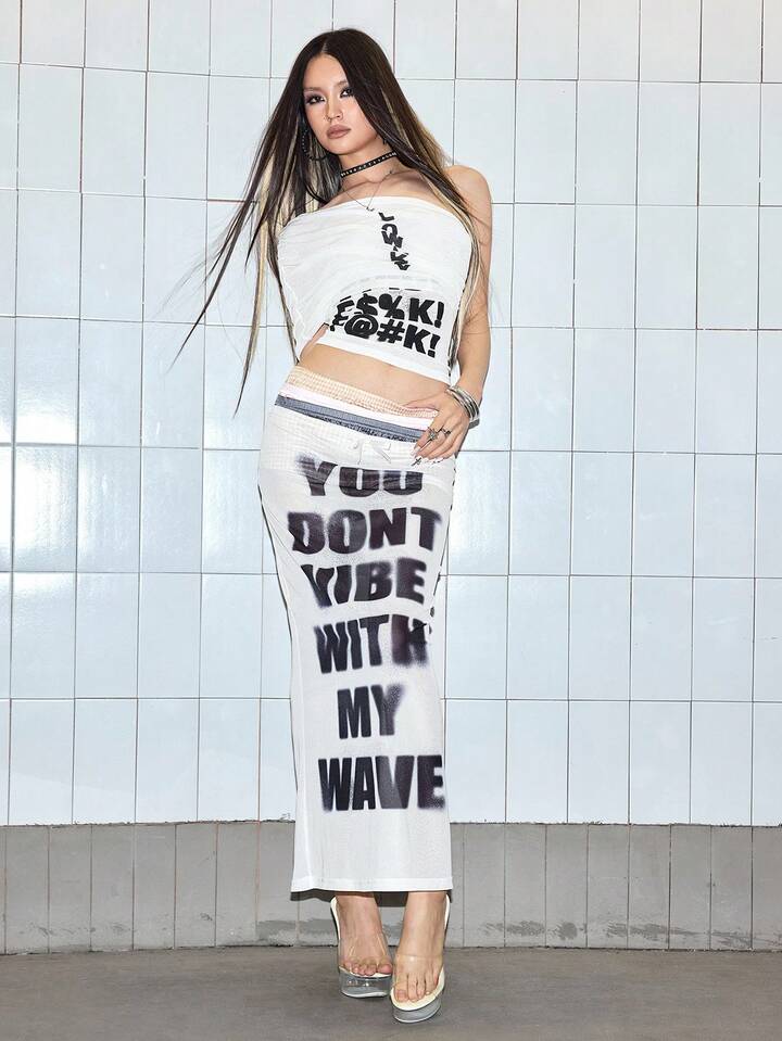 ROMWE Avant Top ajustado para mujer con estampado asimétrico de hombro de eslogan borroso y sexy