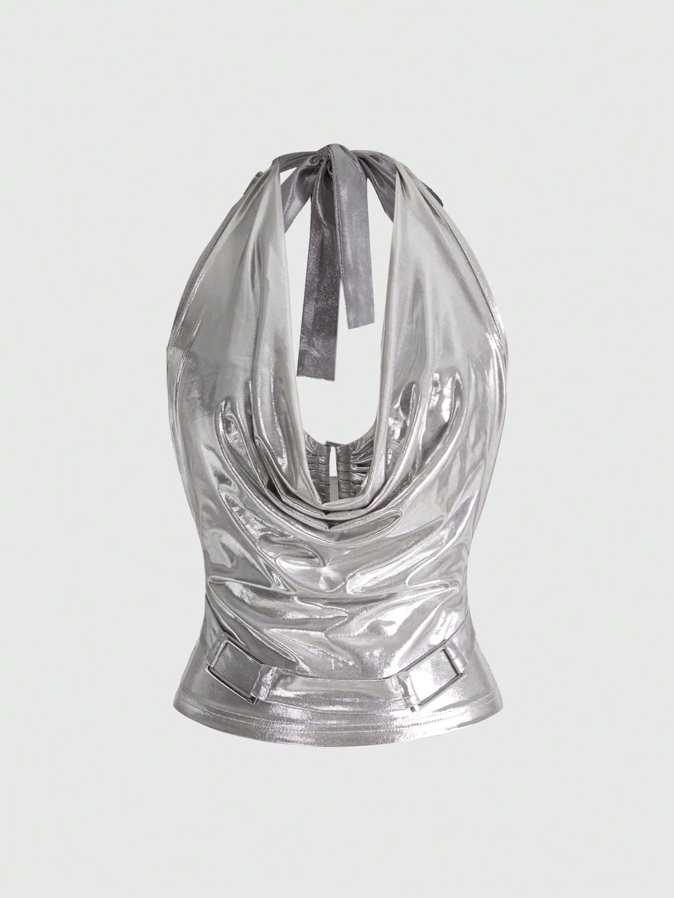 ROMWE Avant Top halter de 2 en 1 con escote en V profundo y cuello metálico plateado vintage sin mangas para mujeres