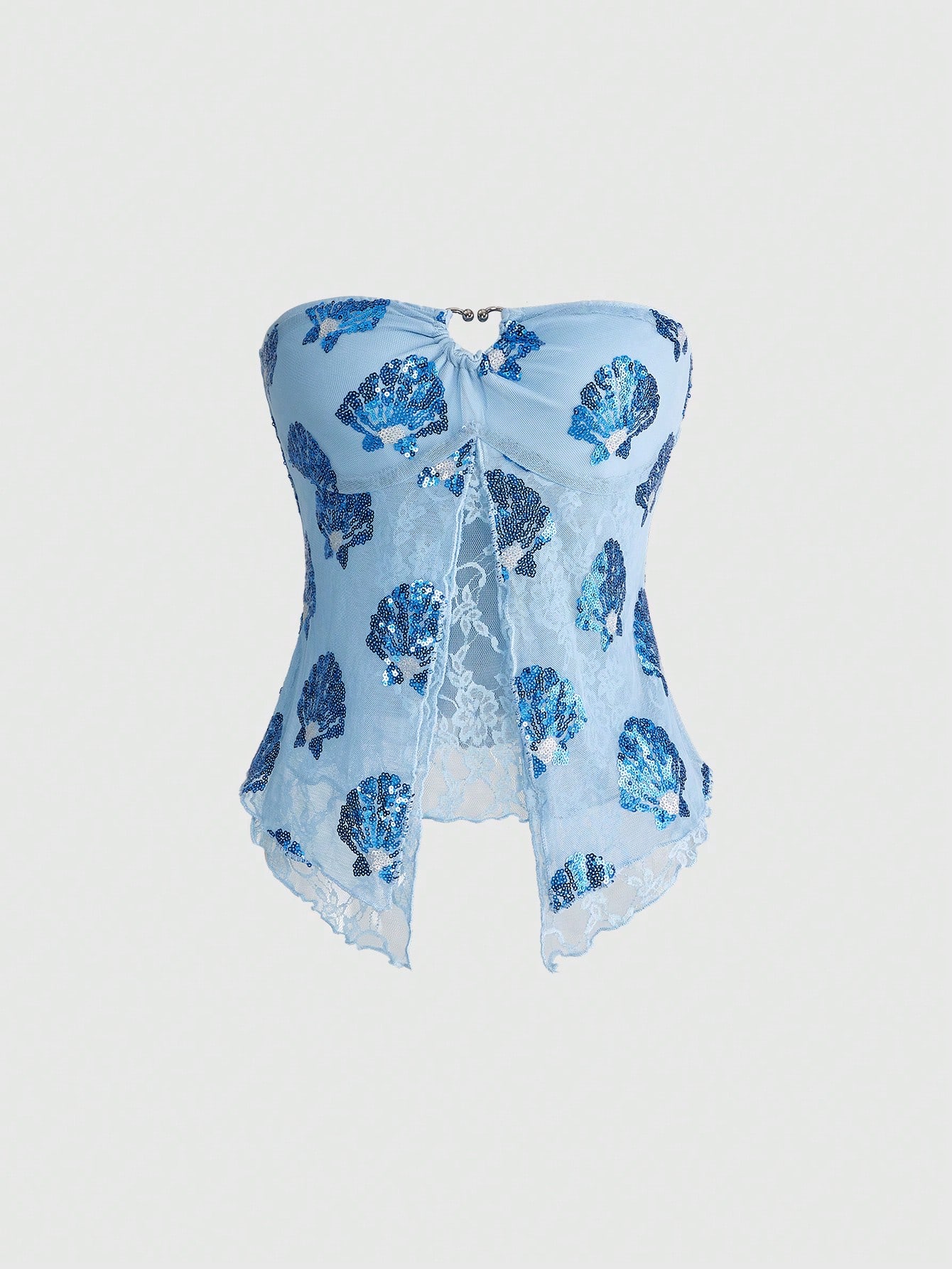 ROMWE Avant Top de camisola con bordado de conchas marinas, lentejuelas y encaje calado en contraste, sexy para el verano